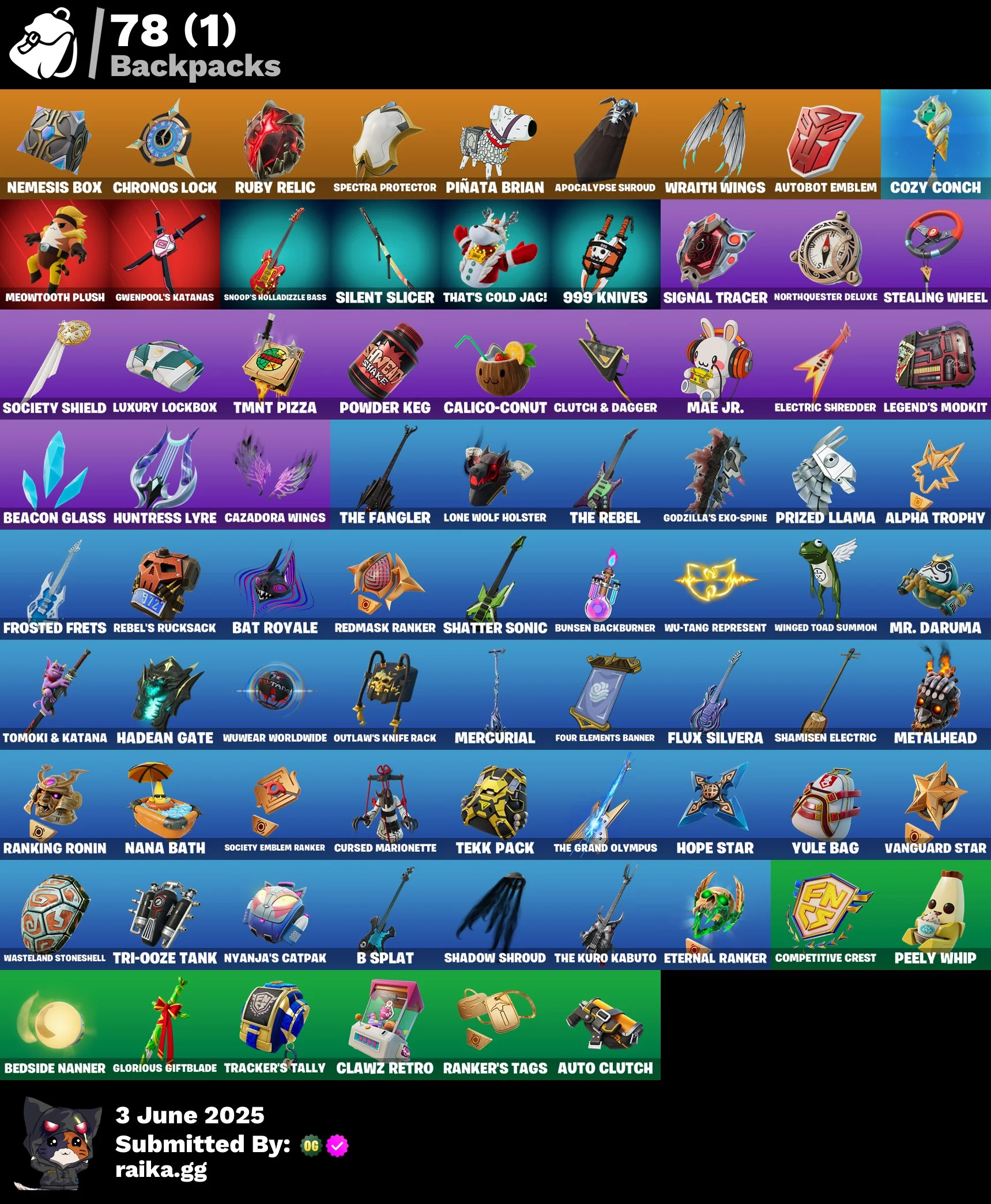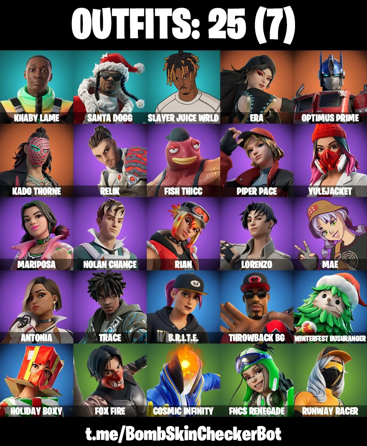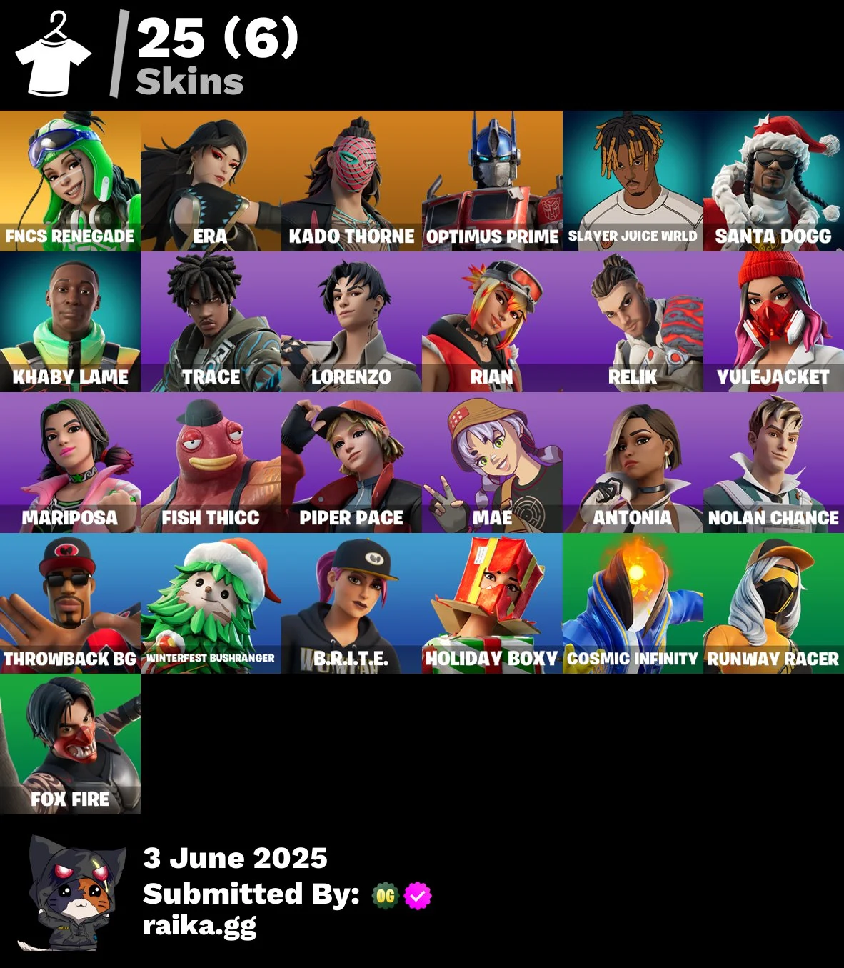 25 skins | FNCS Renegade | Era | Kado Thorne | Optimus Prime | Slayer Juice WRLD | Santa Dogg | Khaby Lame | Trace | Lorenzo | Rian | Relik | Nai@1