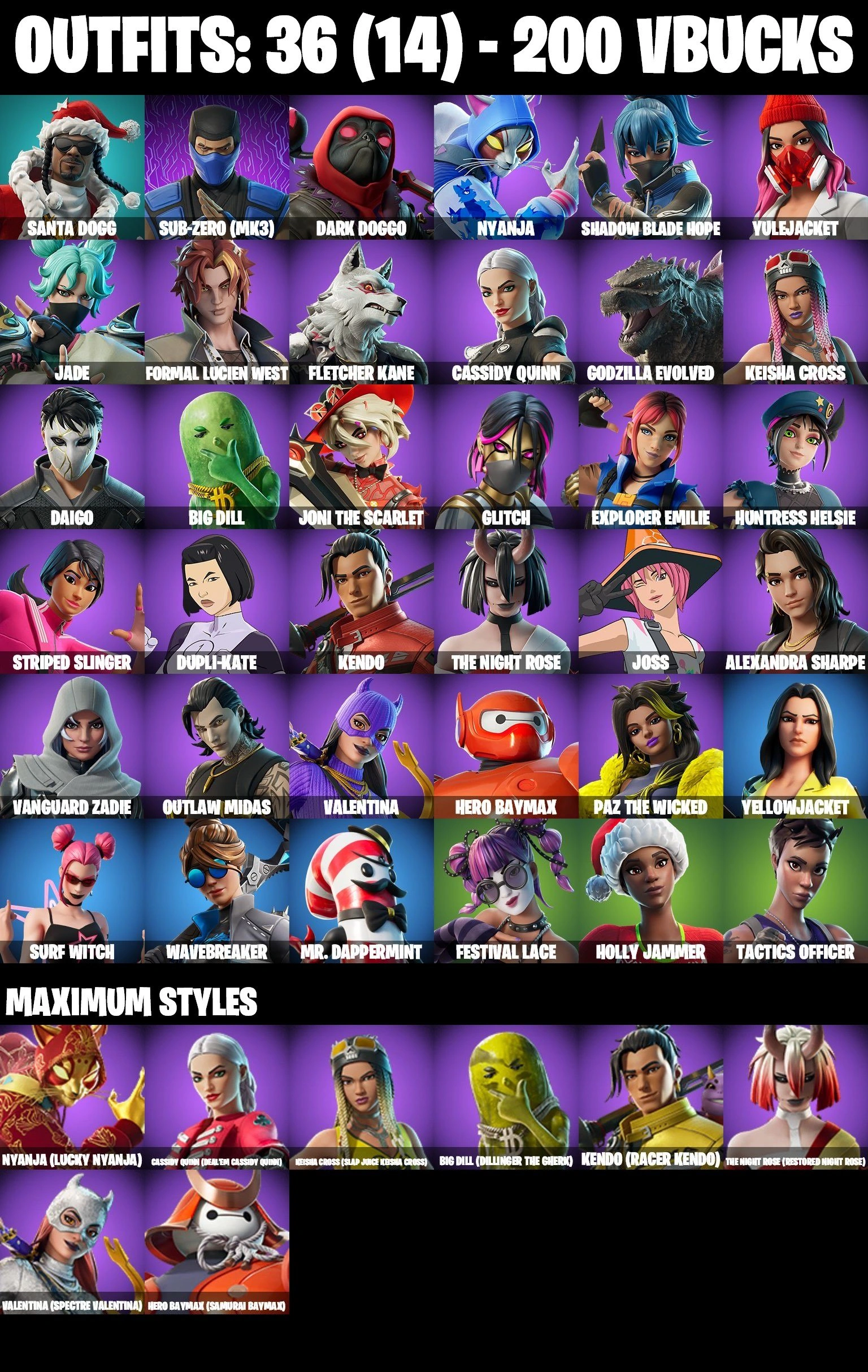 36 SKINS ⸱ SURF WITCH ⸱ SUB-ZERO MK3 ⸱ DARK DOGGO ⸱ FORMAL LUCIEN WEST ⸱ GLITCH ⸱ JOSS ⸱ WAVEBREAKER ⸱ PAZ THE WICKED ⸱ FESTIVAL LACE ⸱ OUTLAW MIDAS ⸱ HUNTRESS HELSIE ⸱ ALEXANDRA SHARPE ⸱ NYANJA ⸱ JADE