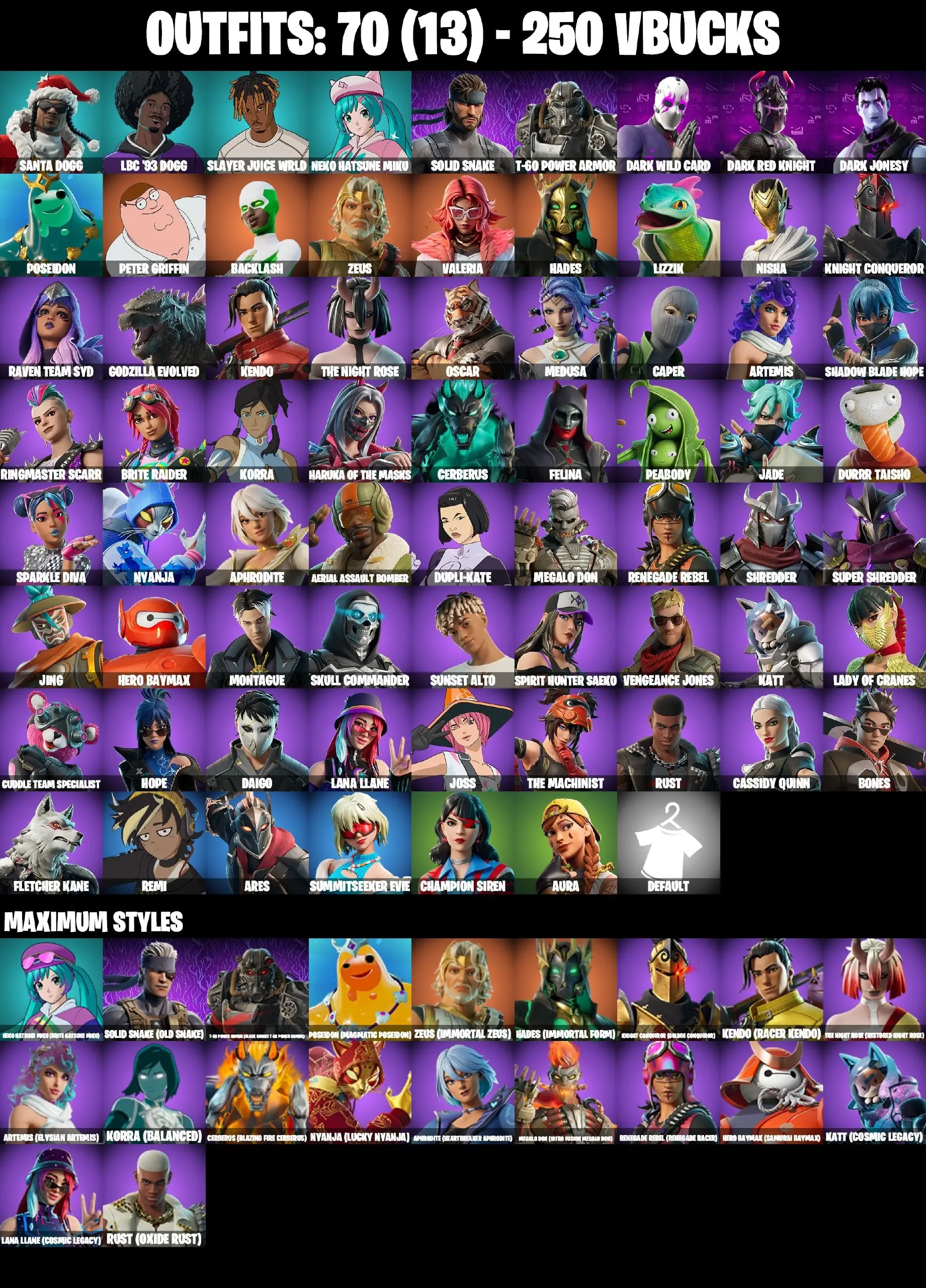 70 SKINS | BACKLASH | JABBA SWITCHWAY | GET GRIDDY | NEKO HATSUNE MIKU MAX | CHAMPION SIREN | STAR WAND | ARTEMIS MAX | LANA LLANE MAX | KATT MAX | SPIRIT HUNTER SAEKO | LADY OF CRANES | SUMMITSEEKER EVIE | AURA | ARES | DURRR TAI