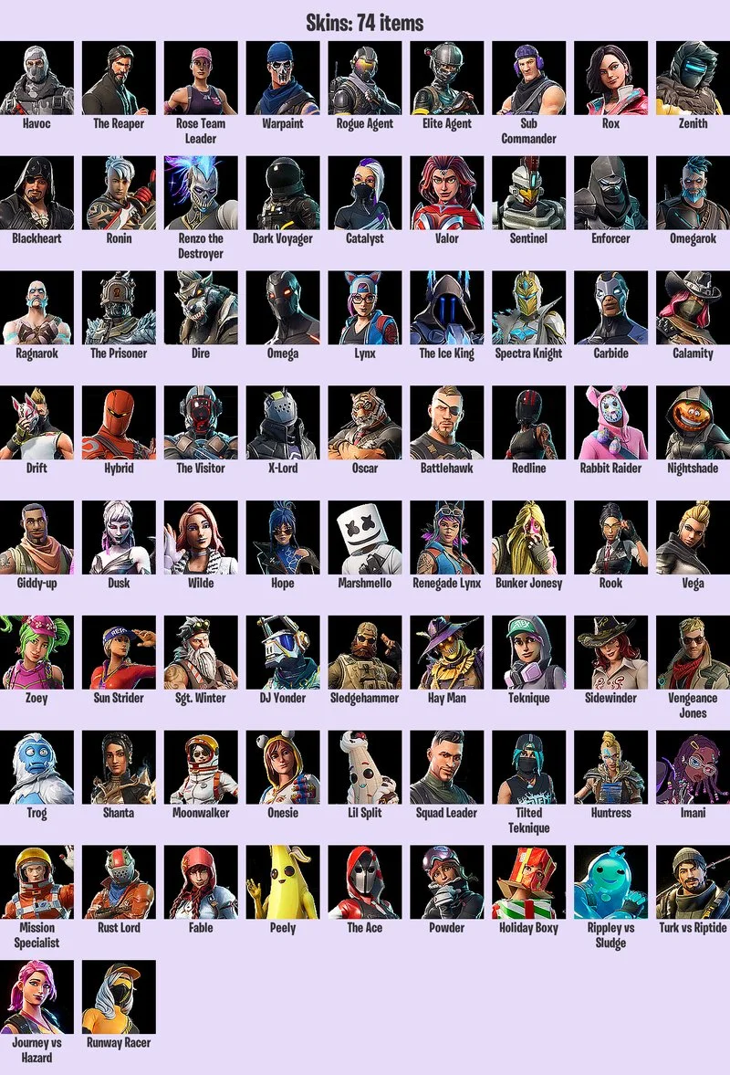74 Skins|OG STW|Havoc|The Reaper|Rose Team Leader|Warpaint|Rogue Agent|Elite Agent|Sub Commander|Rox|Zenith|Blackheart|Ronin