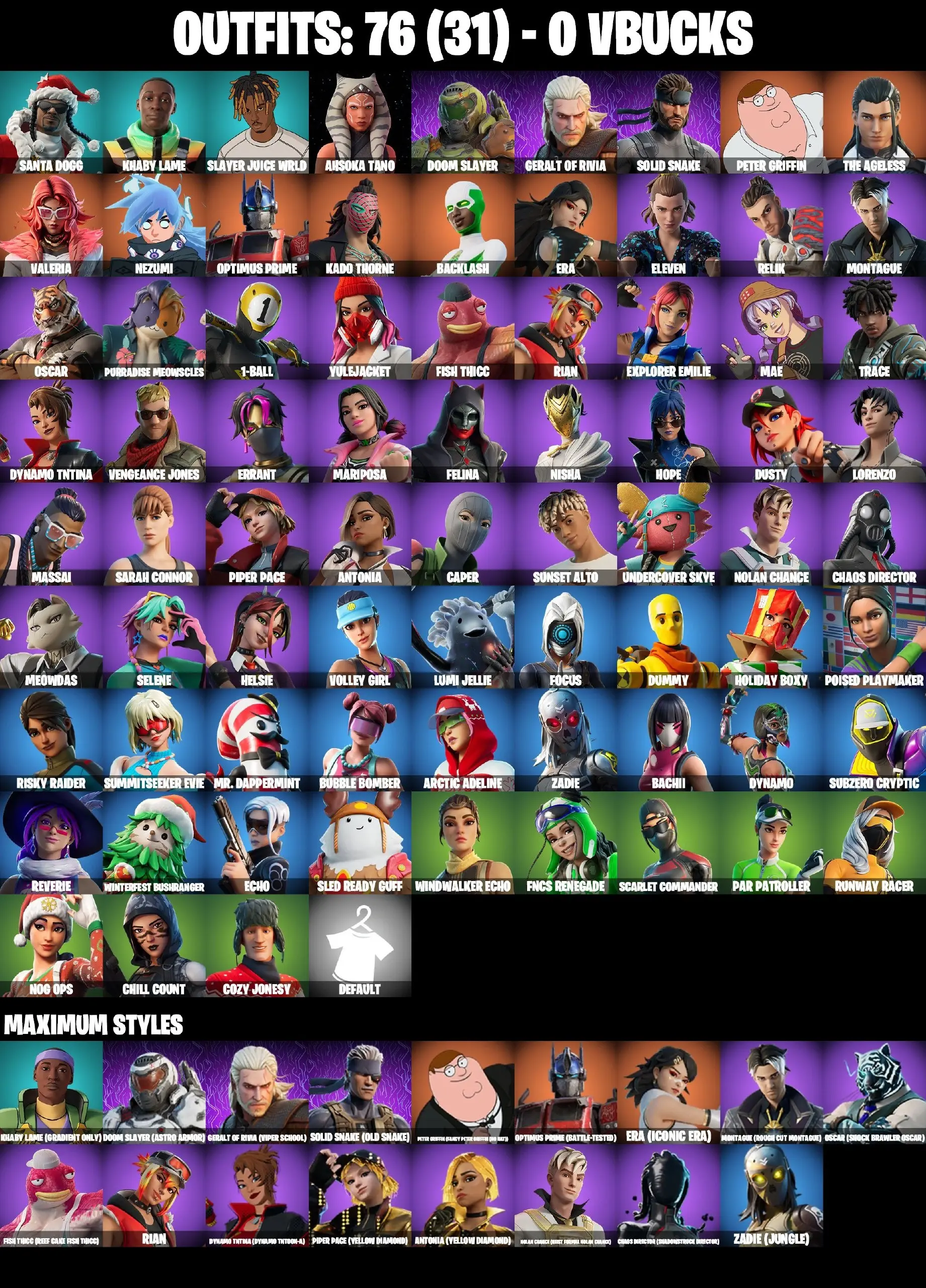 76 SKINS | THE AXE OF CHAMPIONS 2.0 | BACKLASH | AHSOKA TANO | JABBA SWITCHWAY | GET GRIDDY | STAR WAND | SARAH CONNOR | DUMMY | ERA MAX | CHAOS DIRECTOR MAX | SUMMITSEEKER EVIE | HELSIE | MARIPOSA | REVERIE | POISED PLAYMAKER | N