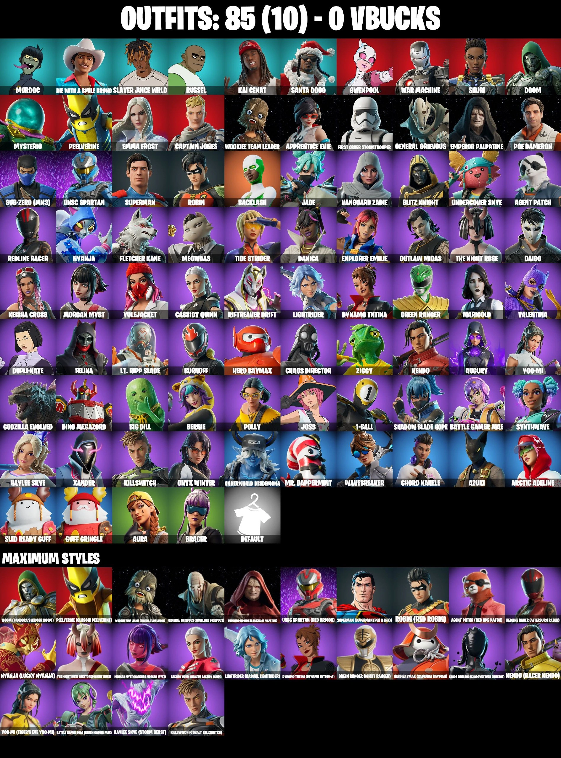 85 SKINS | BACKLASH | OUTLAW MIDAS | GET GRIDDY | WOOKIE TEAM LEADER MAX | APPRENTICE EVIE | FIRST ORDER STORMTROOPER | GENERAL GRIEVOUS MAX | EMPEROR PALPATINE MAX | POE DAMERON | SUB-ZERO MK3 | MURDOC | RUSSEL | CHAOS DIRECTOR M