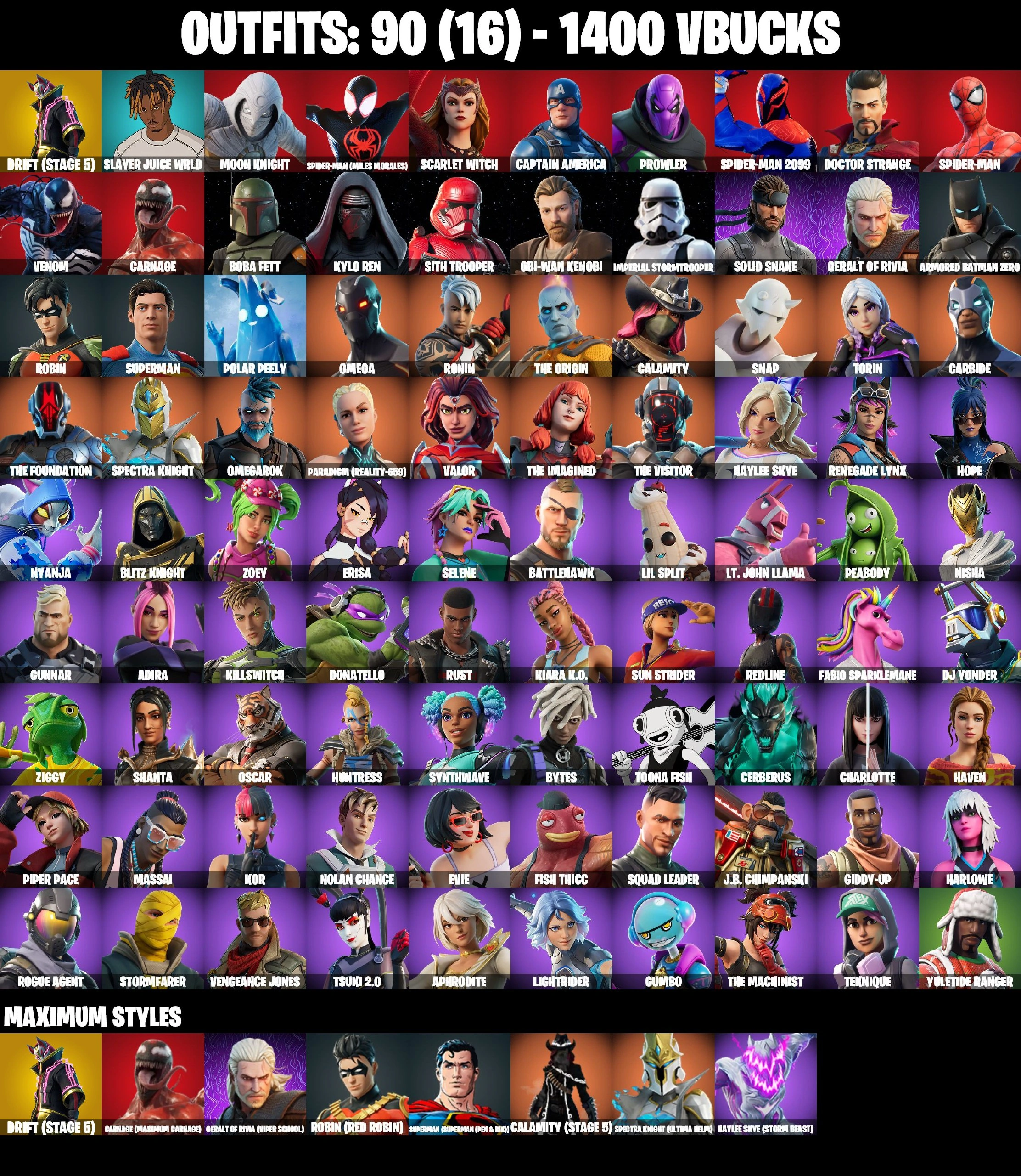 90 SKINS ⸱ STUCK ⸱ OMEGA ⸱ CARBIDE ⸱ SUPERMAN ⸱ ROBIN ⸱ CALAMITY ⸱ CARBIDE ⸱ MOON KNIGHT ⸱ SPIDER-MAN MILES MORALES ⸱ CAPTAIN AMERICA ⸱ SPIDER-MAN 2099 ⸱ SPIDER-MAN ⸱ BOBA FETT ⸱ OBI-WAN KENOBI ⸱ HAYLEE SKYE ⸱ TOONA FISH ⸱ KOR ⸱ R