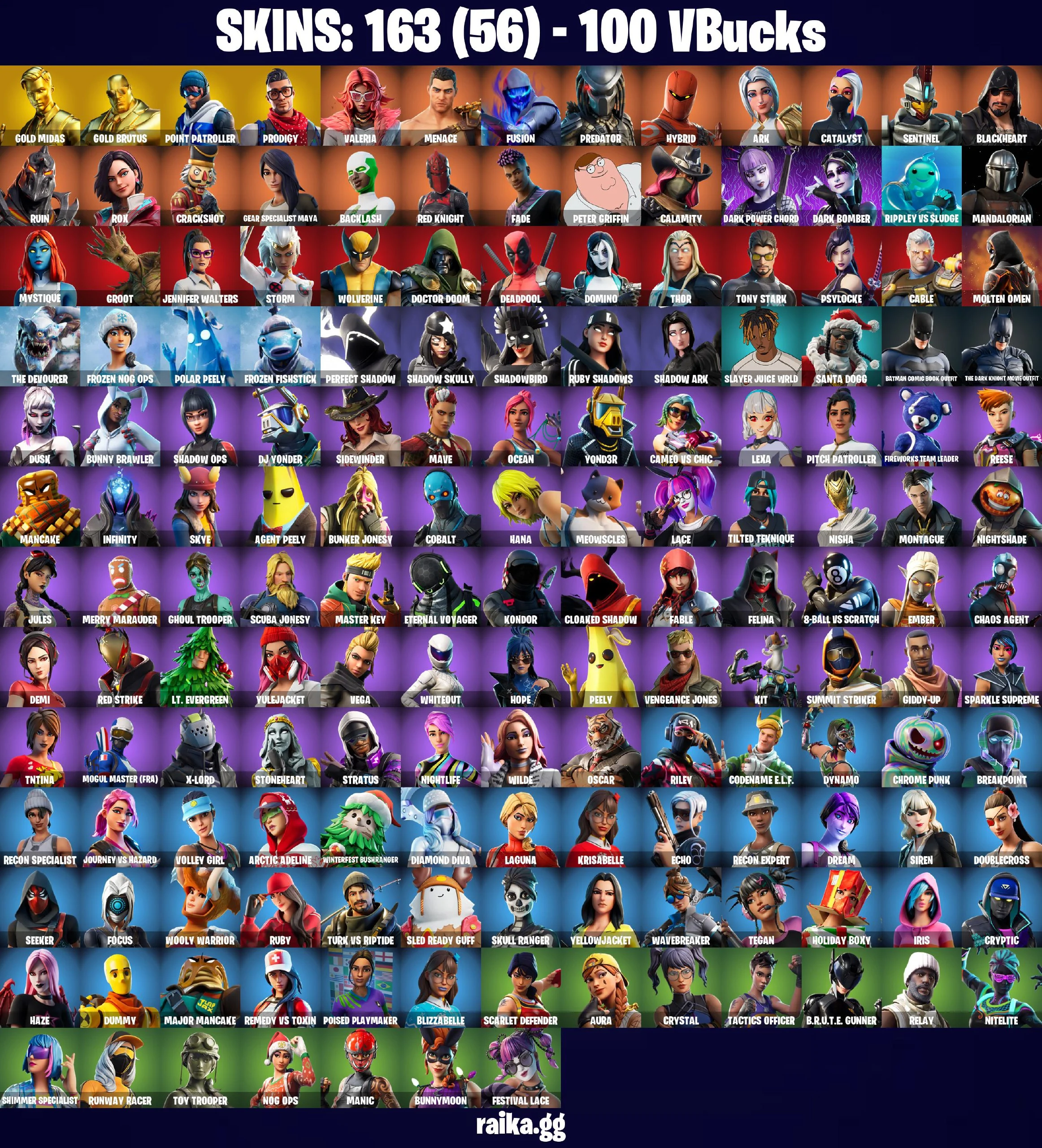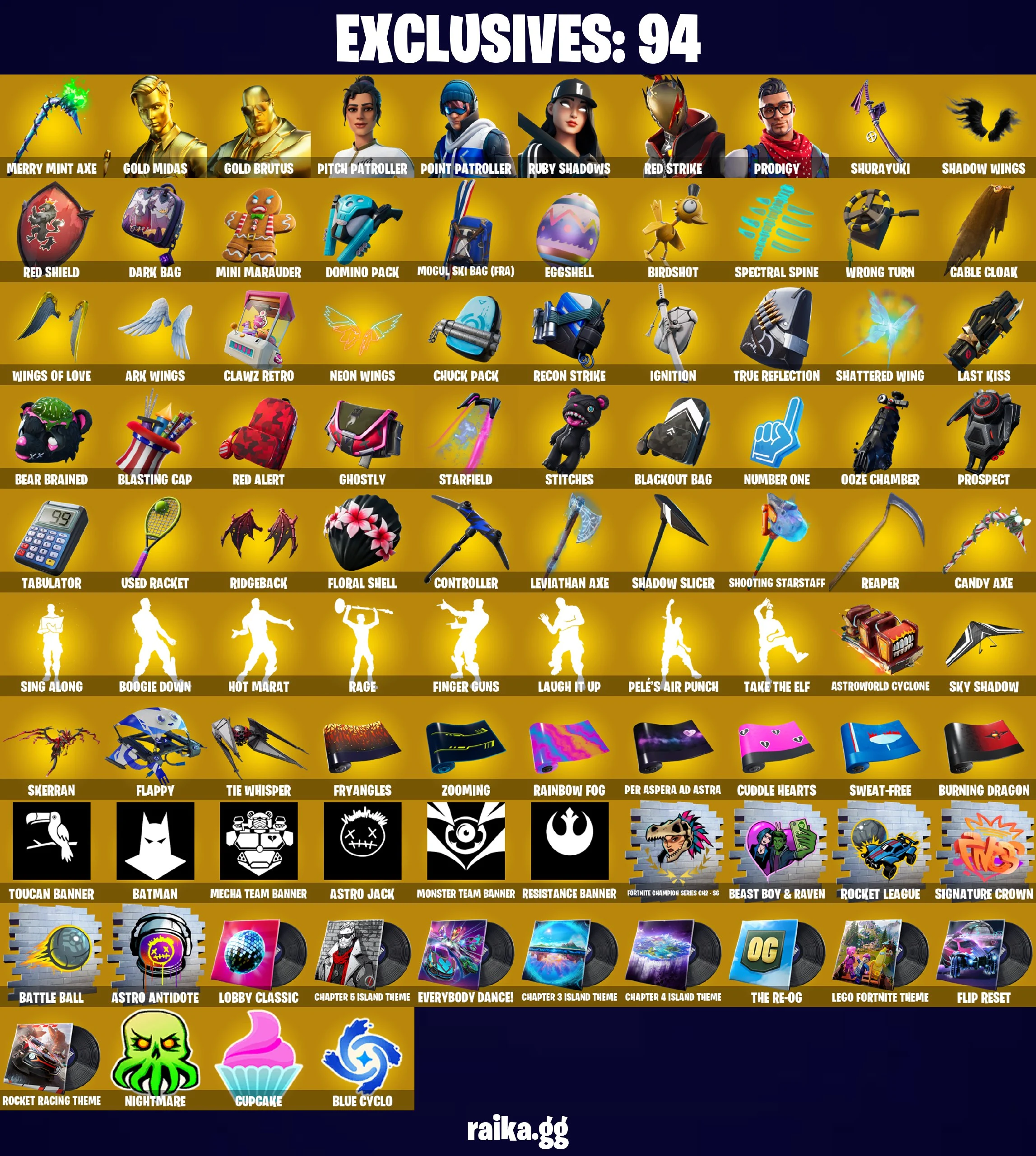 🔥🧨 EXCLUSIVE OFFER 🧨🔥 163 skins 💎 Merry Mint Axe 💎 Gold Midas 💎 Gold Brutus 💎 Point Patroller 💎 Prodigy 💎 Valeria 💎 Menace 💎 Fusion 💎 Predator 💎 Hybrid 💎 Ark 💎 Catalyst 💎 Sentinel 💎 Blackheart 💎 Ruin 💎 Rox 💎 PC\XBOX\SWITCH 💎