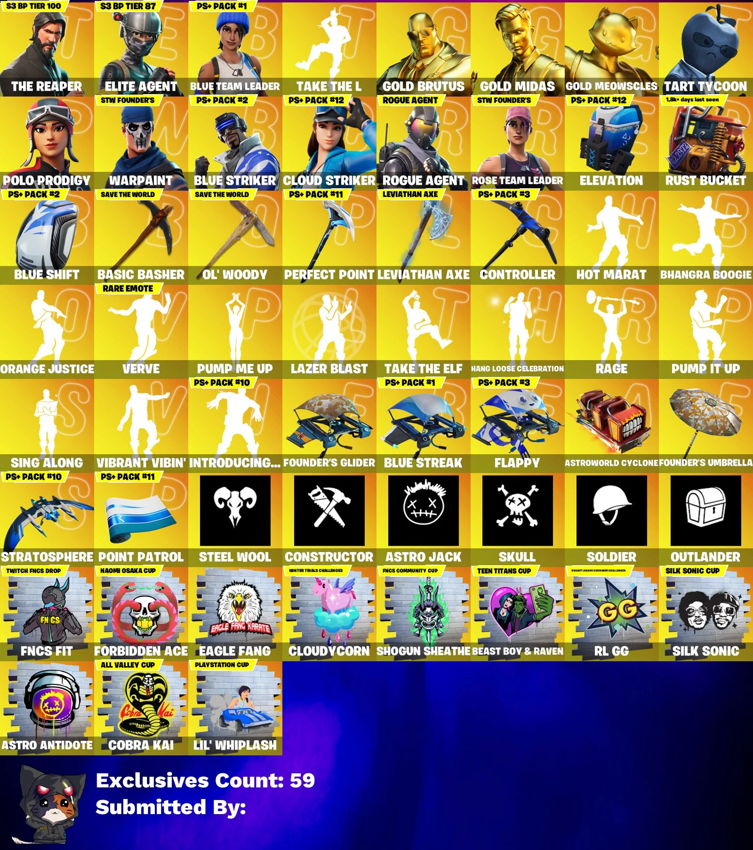 💥🌟 LEGENDARY ACCOUNT 🌟💥 209 SKINS 💎 POLO PRODIGY 💎 THE REAPER 💎 TAKE THE L 💎 LEVIATHAN AXE 💎 GOLD BRUTUS 💎 GOLD MIDAS 💎 GOLD MEOWSCLES 💎 TART TYCOON 💎 BLUE STRIKER 💎 CLOUD STRIKER 💎 ROGUE AGENT 💎 VALOR 💎 DRIFT 💎 545 VB 💎 OG STW 💎 FULL ACCESS 💎