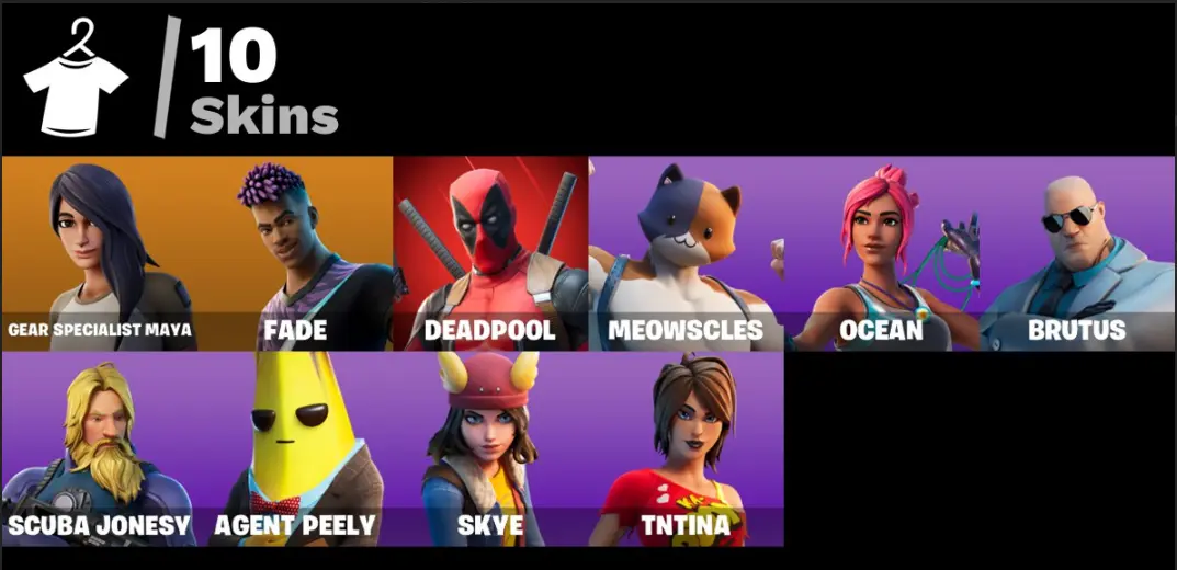 [PC] 10 skins | Gear Specialist Maya | Fade | Deadpool | Meowscles | Ocean | Brutus | Scuba Jonesy | Agent Peely | Skye | TNTina | Arroyo Pack | 400 VB