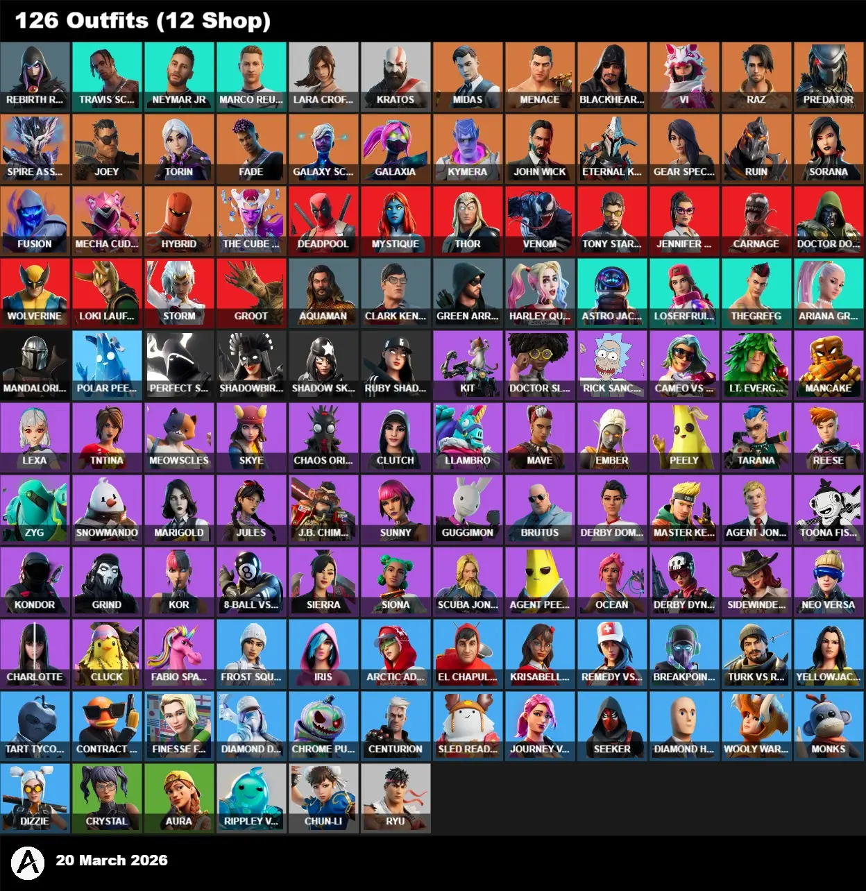 | PC | 126 Skins | Travis Scott | Leviathan Axe | Lara Croft | Rebirth Raven | Kratos | Neymar Jr | Marco Reus | Astro Jack | Loserfruit | TheGrefg | Ariana Grande | Midas | Menace | Blackheart | Vi