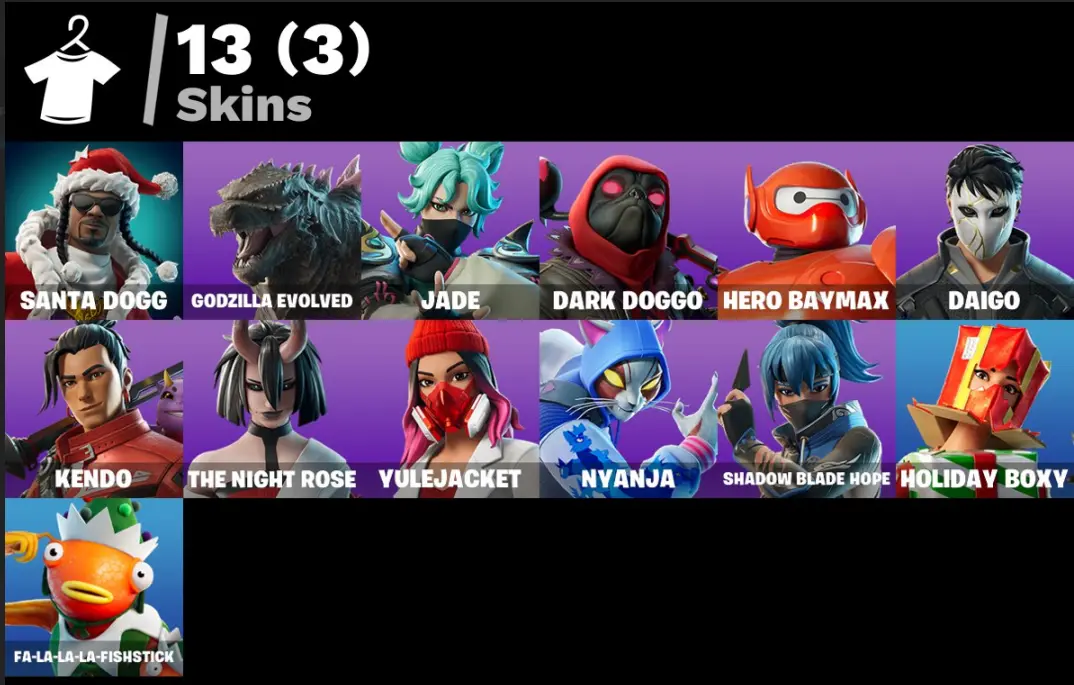 [PC] 13 skins | Santa Dogg | Godzilla Evolved | Jade | Dark Doggo | Hero Baymax | Daigo | Kendo | The Night Rose | Yulejacket | Nyanja | 200 VB