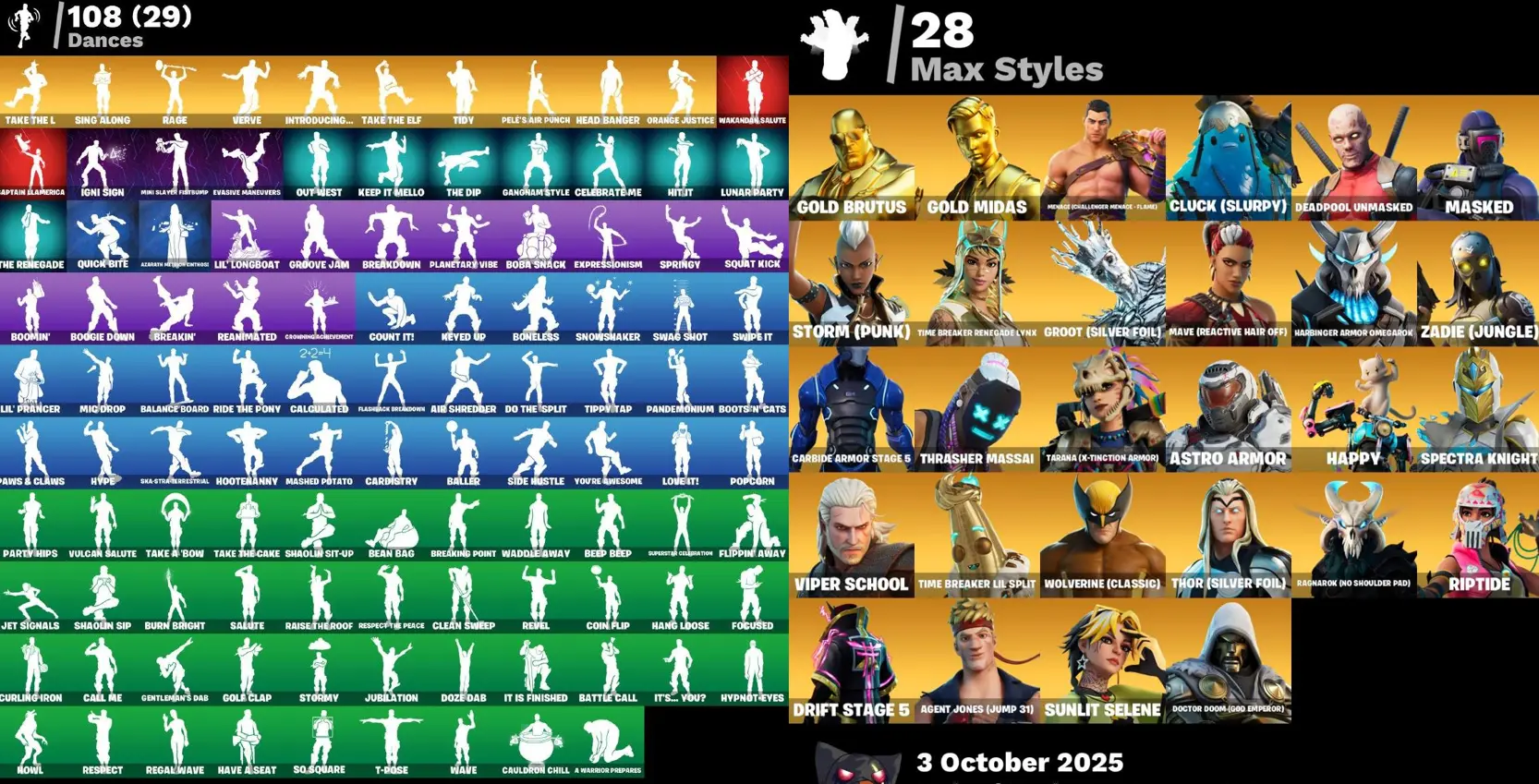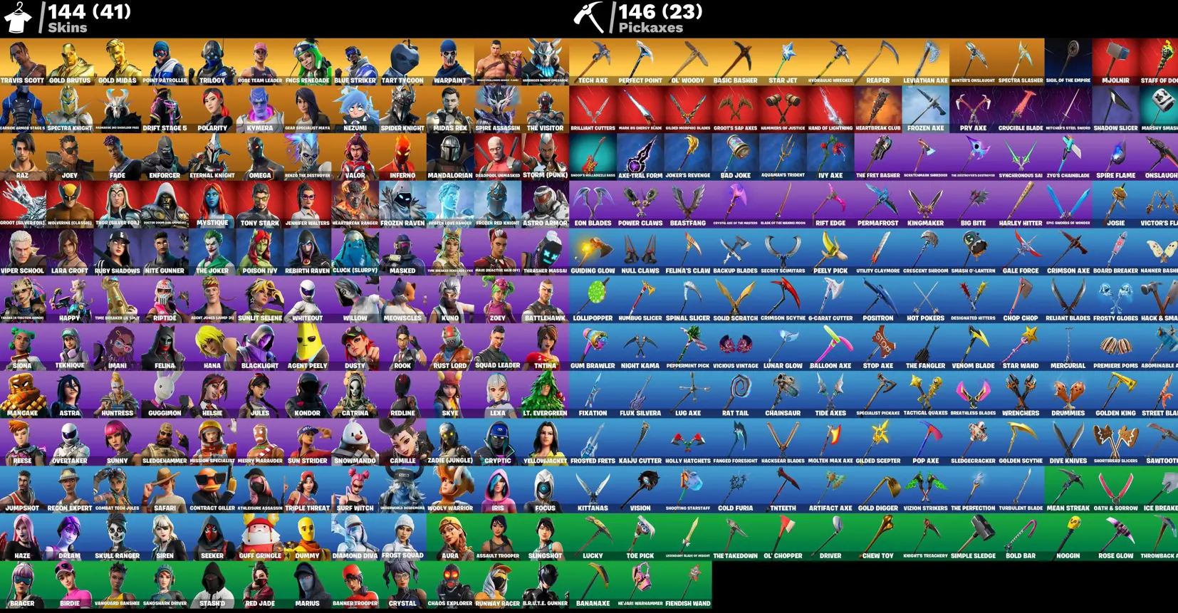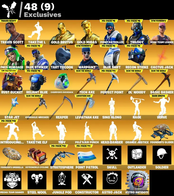 [PC] 144 skins| Travis Scott |Gold Brutus| Gold Midas| Point Patroller| Trilogy| FNCS Renegade| Leviathan Axe| Take The L| OG STW |Blue Striker|M204