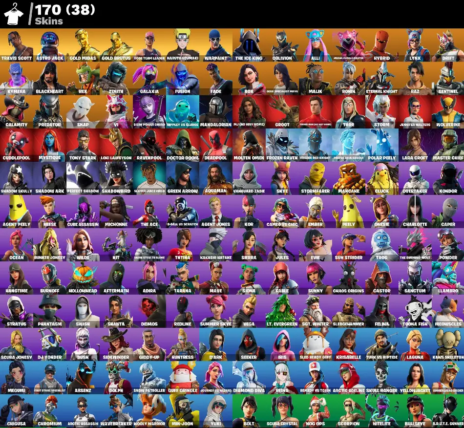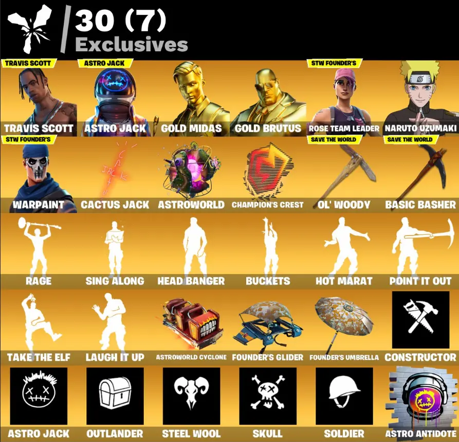 [PC] 🎮 170 Skins | 🛡️ OG STW | 🎤 Travis Scott | ⚔️ Master Chief | 🌌 Astro Jack | 👑 Gold Brutus/Midas | 🍜 Naruto Uzumaki | 👾 Predator | 🐱 Lynx | 💠 Fusion | ☠️ Blackheart | 💰 150 V-Bucks