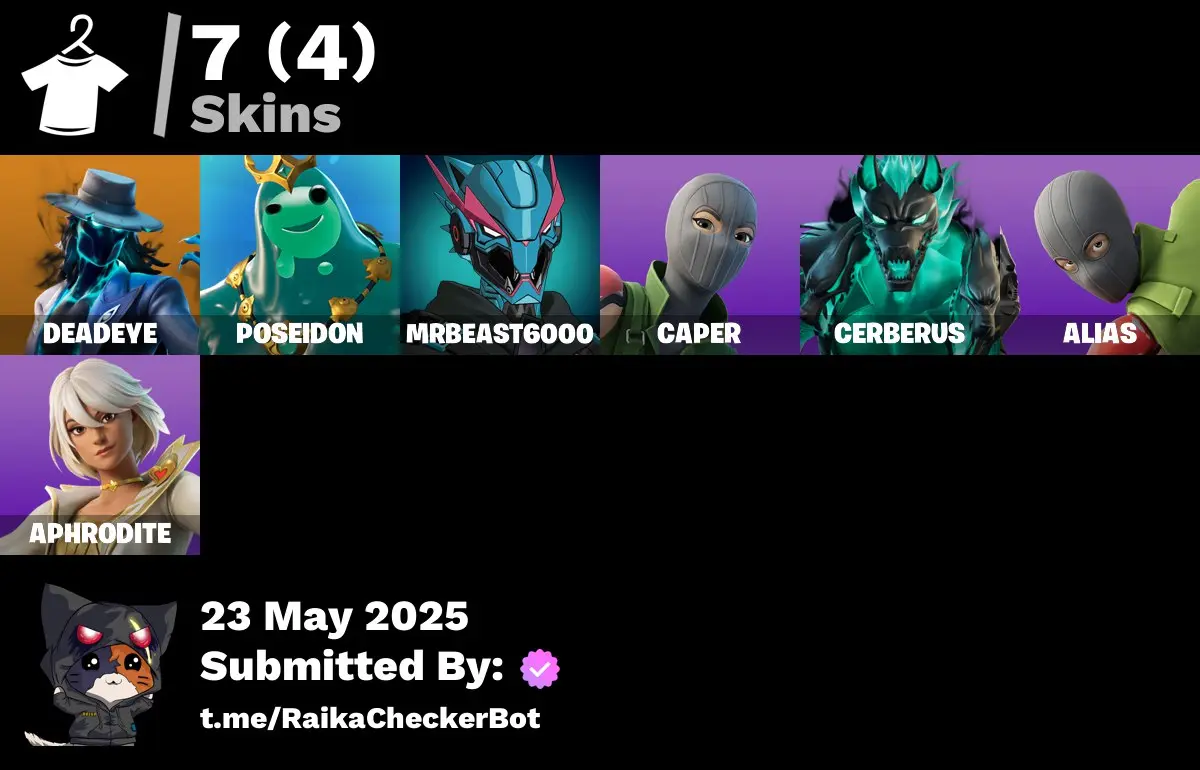 [PC] 6 Skins | Deadeye | Poseidon | MrBeast6000 | Caper | Cerberus | Alias | Aphrodite | Second Sight | Cozy Conch | Prize Package | Hadean Gate | FN32