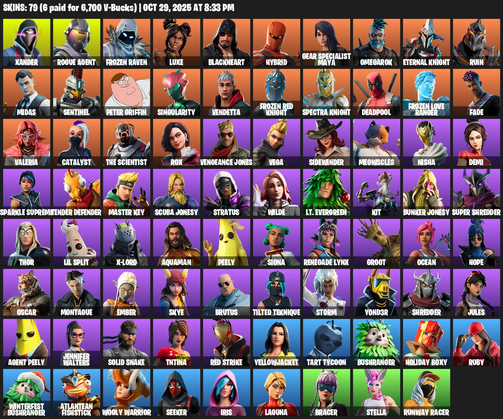 [PC] | 79 skins | Xander | Rogue Agent | Frozen Raven | Luxe | Blackheart | Hybrid | Gear Specialist Maya | Omegarok | #SDX3657 | #MBFN