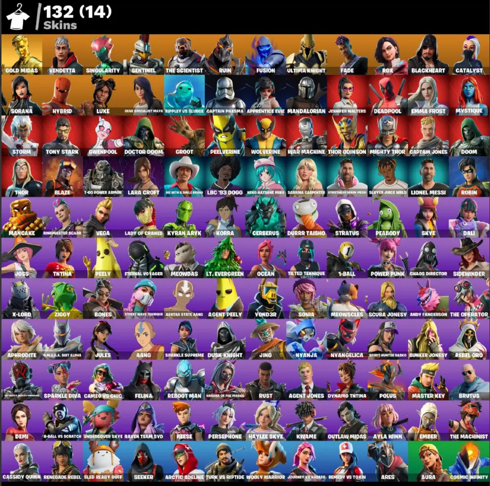 (PC PSN XBOX) 132 skins | Gold Midas | Vendetta | Singularity | Sentinel | The Scientist | Ruin | Fusion | Ultima Knight | Fade | Rox | Blackheart | 6650 VB / LARA CROFT /