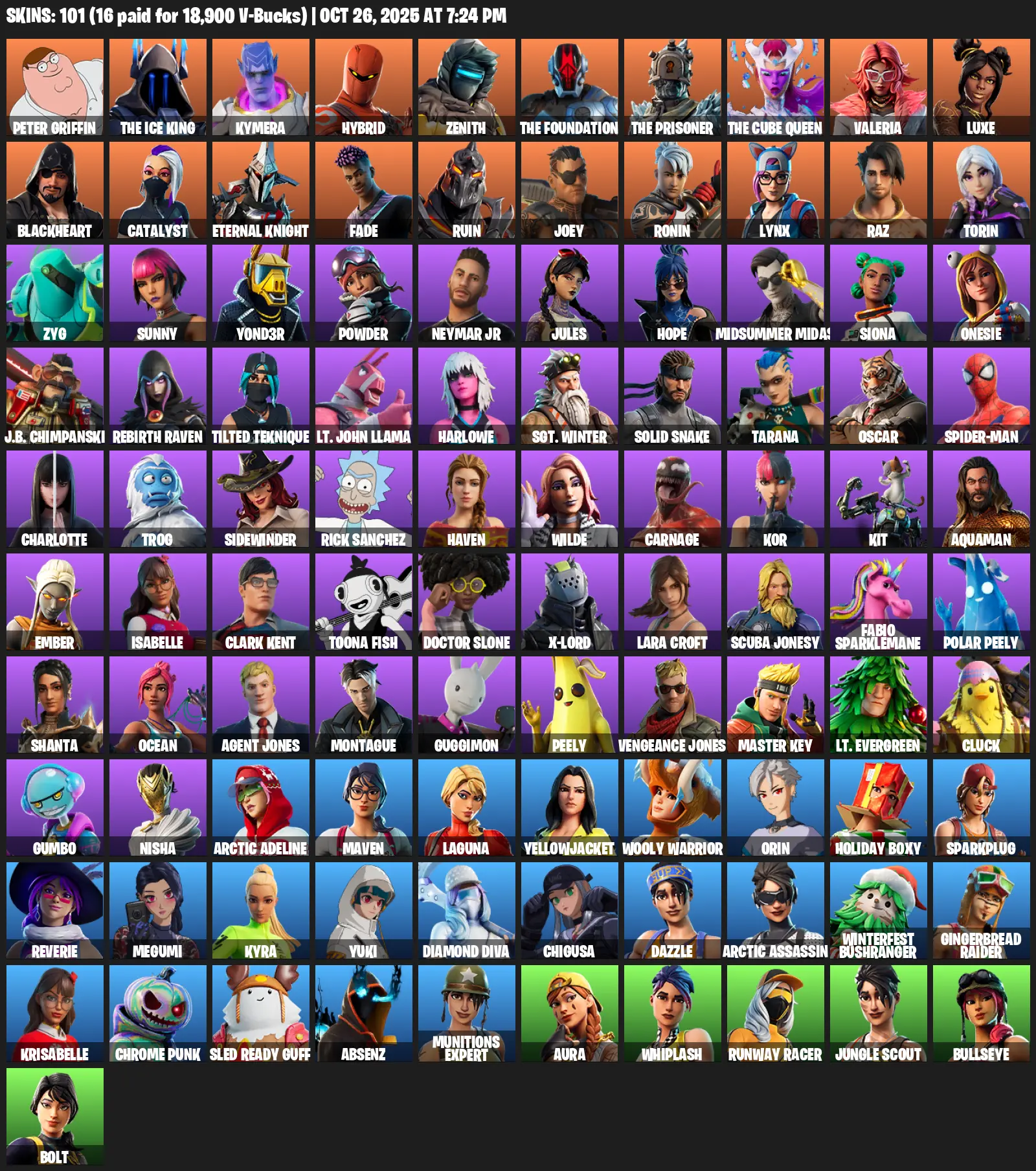 [PC/PSN] | 101 skins | 650 V-bucks | Leviathan Axe | Lara Croft | Peter Griffin | The Ice King | Kymera | Hybrid | Zenith | The Foundation | S4G