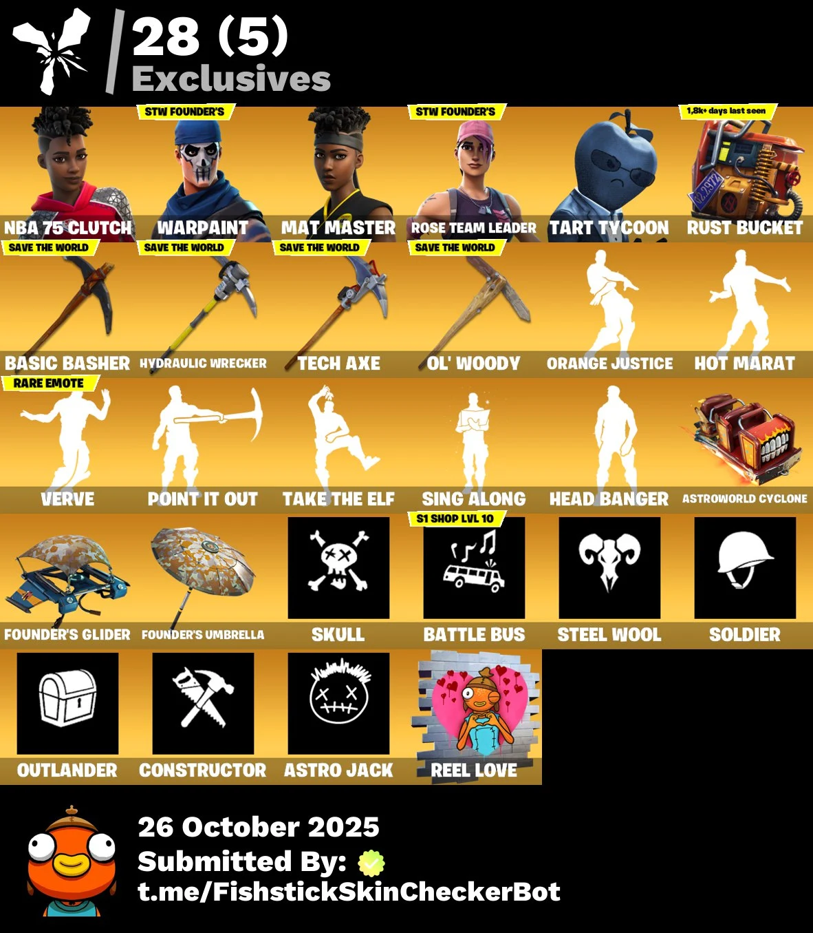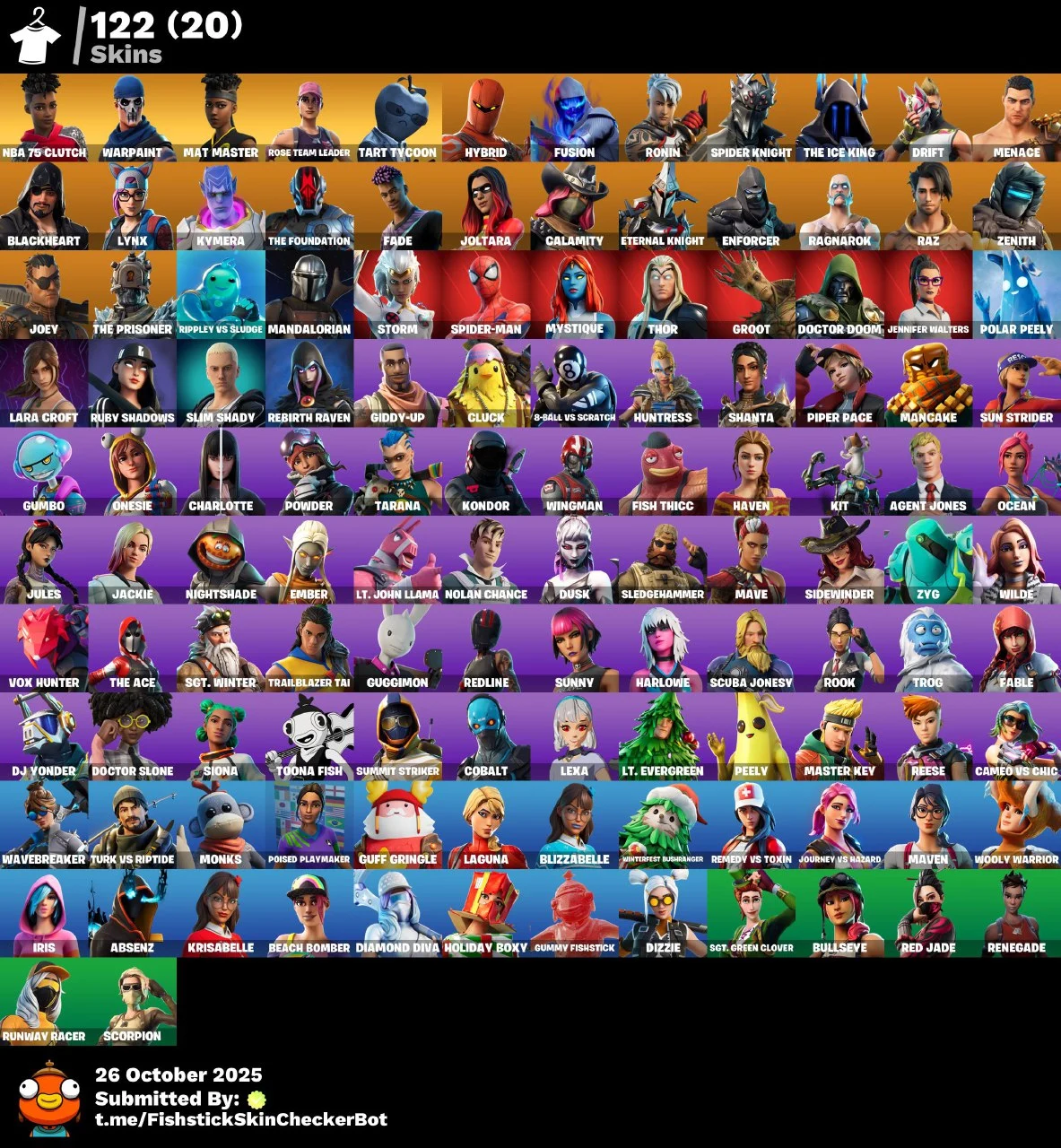 [PC/PSN/NINTENDO] 122 skins | OG STW | NBA 75 Clutch | Mat Master | Tart Tycoon | Hybrid | Fusion | Ronin | Spider Knight | The Ice King | Drift | Menace | 400 VB