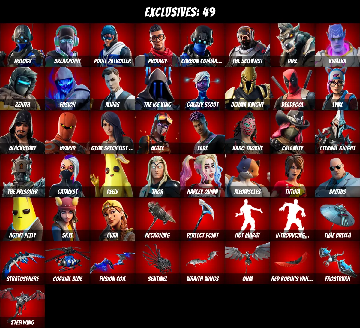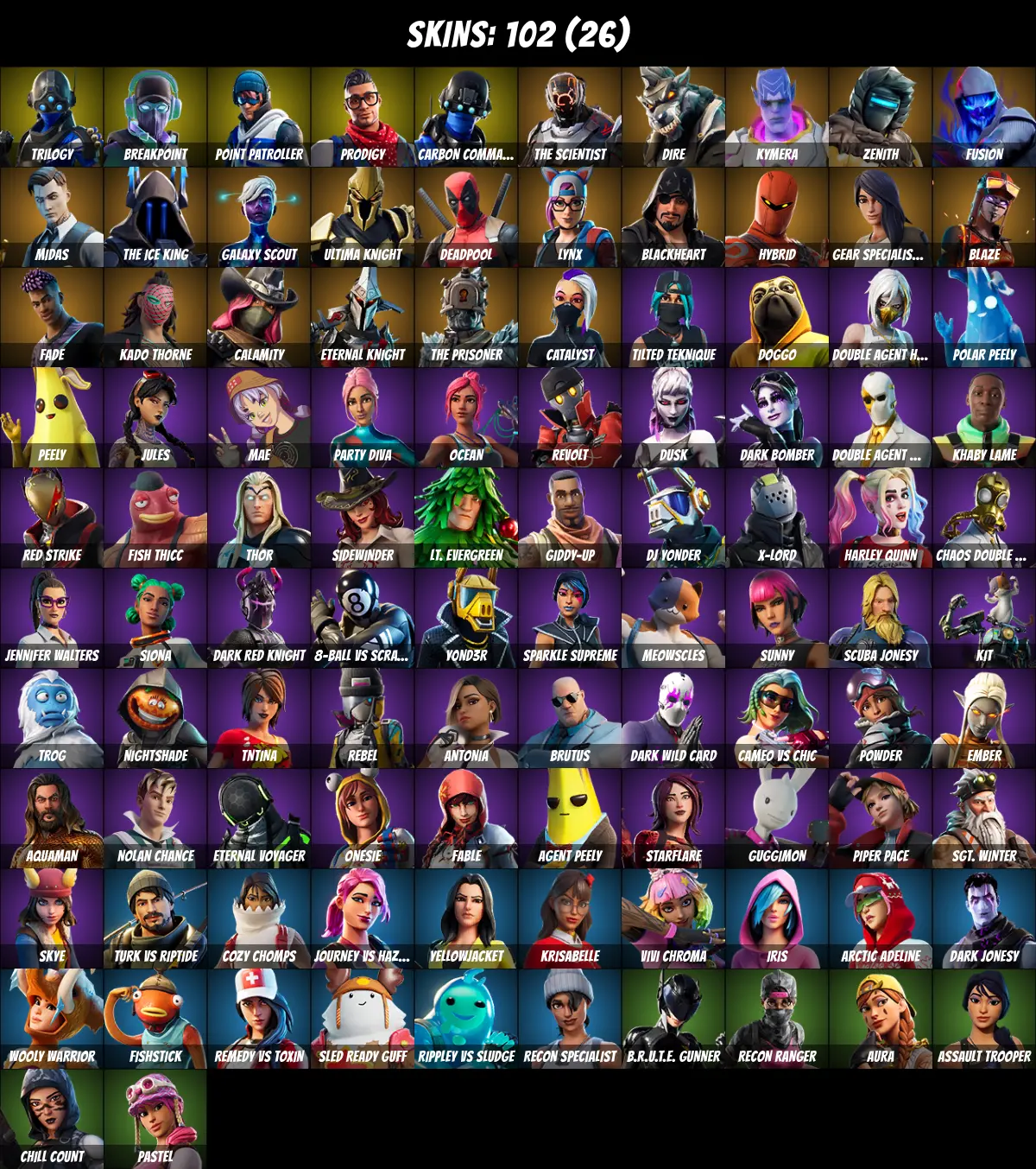 ⚡PC/PSN/XBOX⚡ 102 skins 💎 Deadpool 💎 Harley Quinn 💎 Midas 💎 Lynx 💎 Jules 💎 Blaze 💎 Fishstick 💎 Aura 💎 Peely 💎 Agent Peely 💎 Calamity 💎 Catalyst 💎 Ultima Knight 💎 Meowscles 💎 Thor 💎 TNTina 💎 Brutus 💎 Skye 💎 Blackheart 💎 Trilogy 💎 Breakpoint 💎 200 V-Bucks 💎