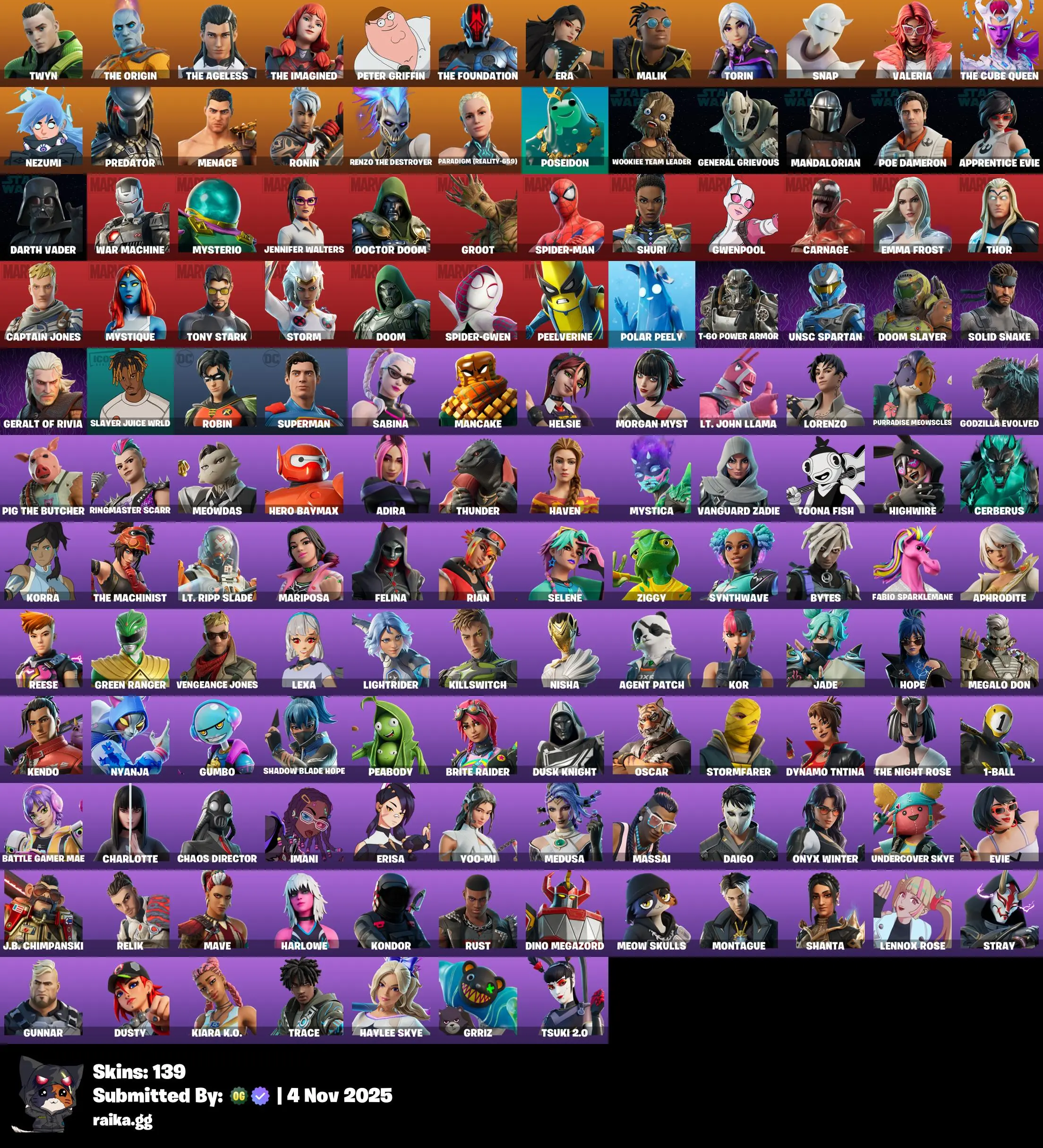 [PC/PSN/XBOX] 139 skins | 3250 VBUCKS | Twyn | The Origin | The Ageless | The Imagined | Peter Griffin | The Foundation | Era | Malik | Torin | Snap | Valeria |