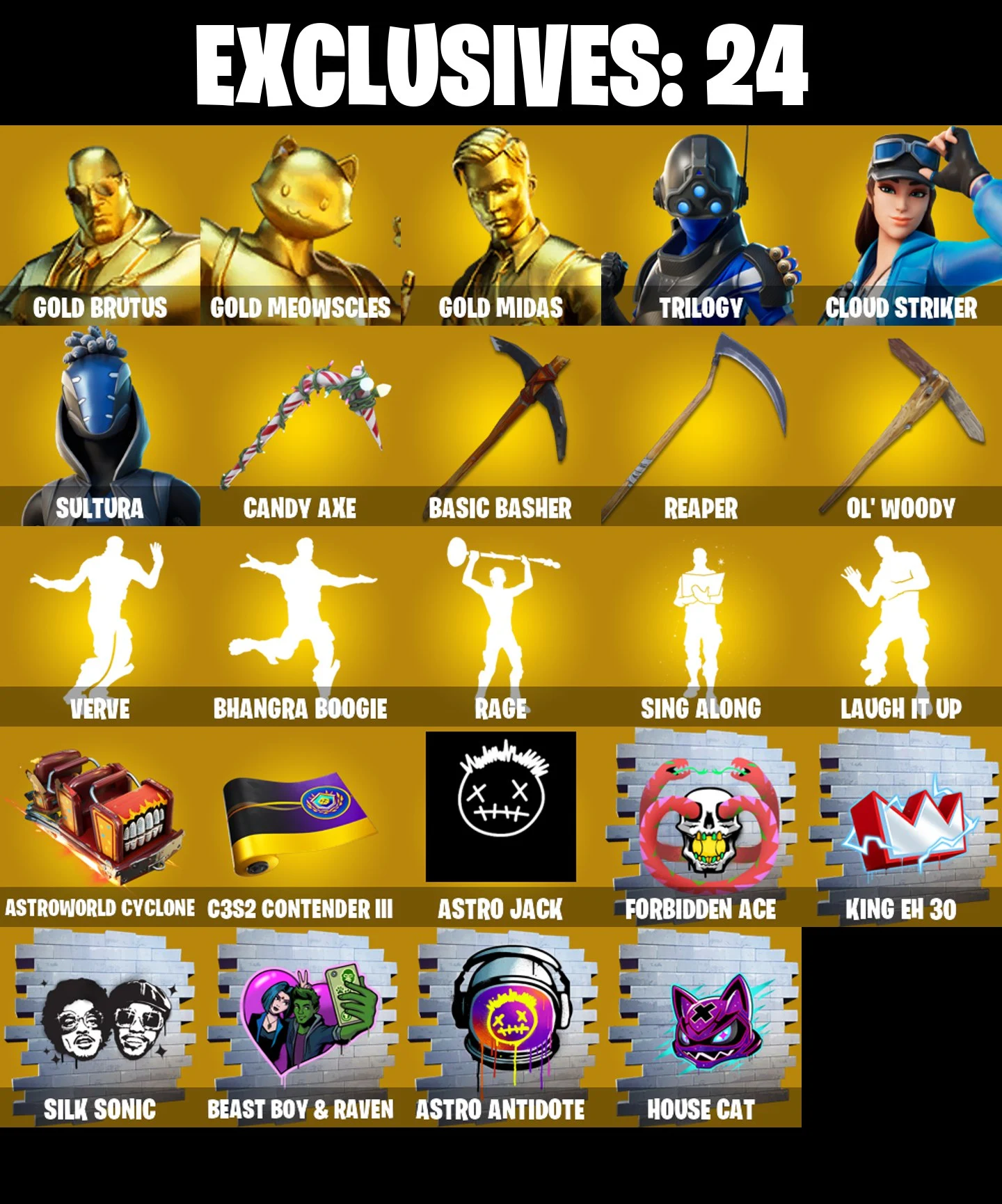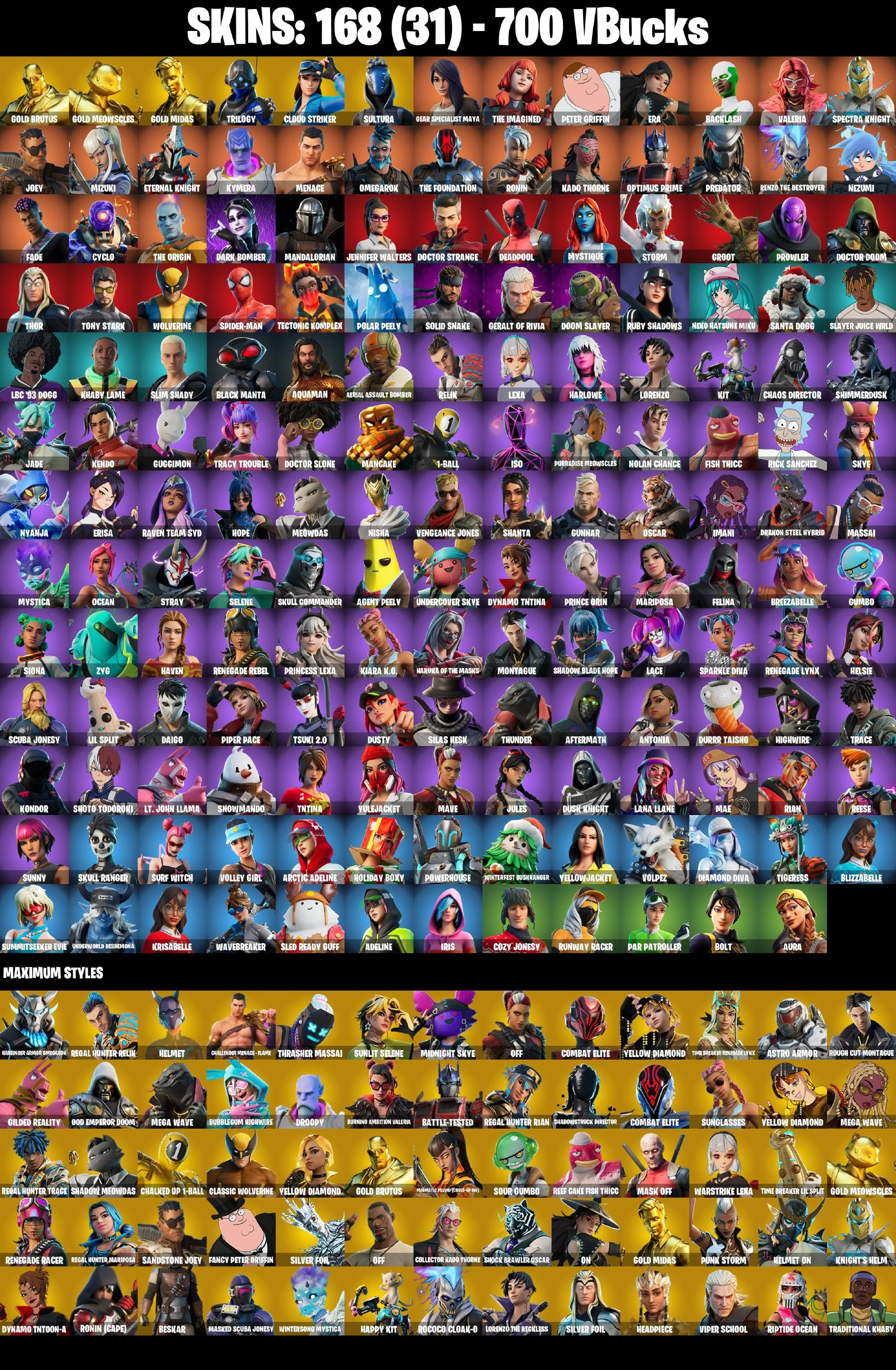 [PC/PSN/XBOX] 168 SKINS ⚡️ Gold Brutus ⚡️ Gold Meowscles ⚡️ Gold Midas ⚡️ Trilogy ⚡️ Cloud Striker ⚡️ Sultura ⚡️ Gear Specialist Maya ⚡️ The Imagined ⚡️ 700 VB