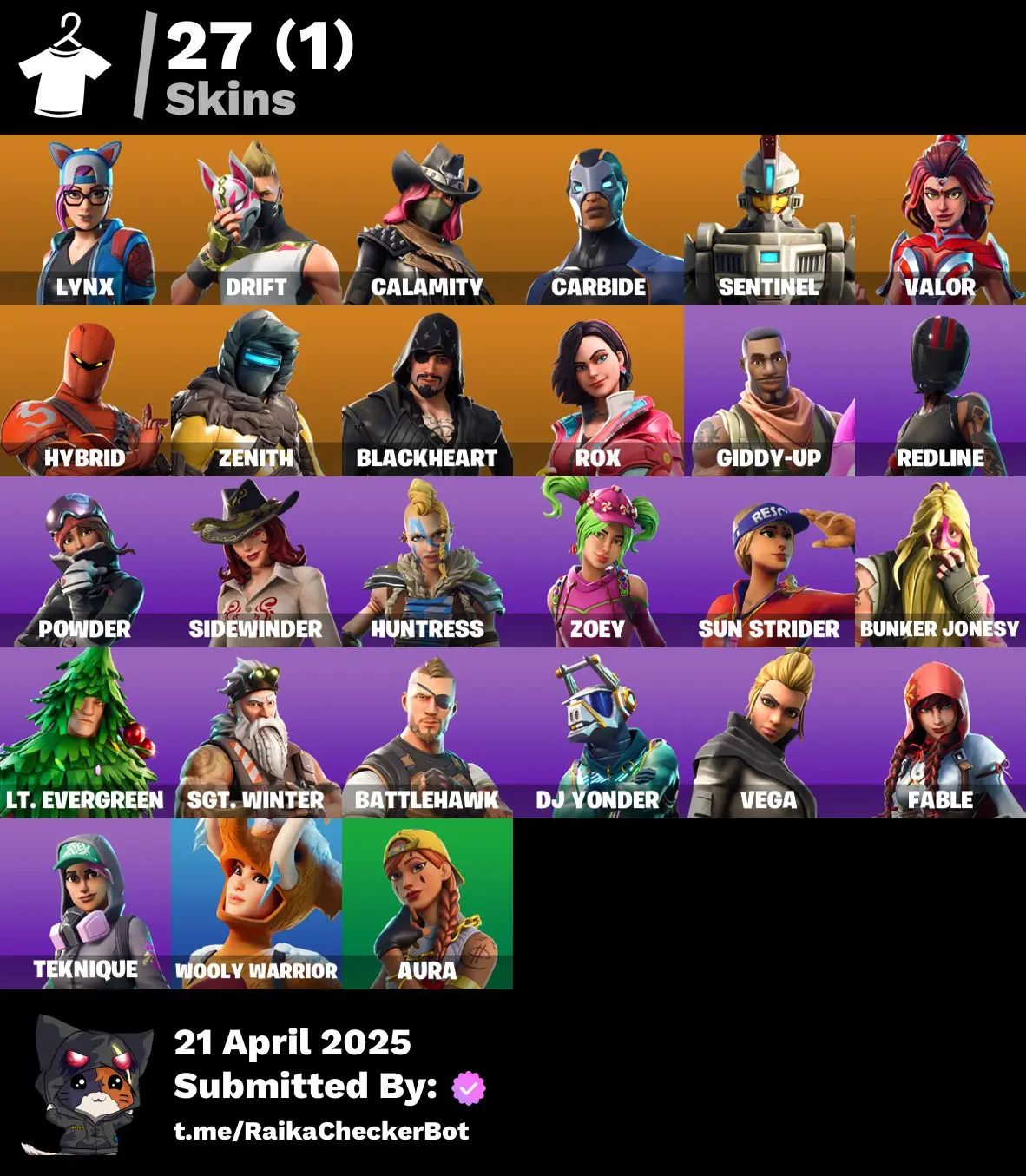 [PC/PSN/XBOX] 27 skins | Lynx | Drift | Calamity | Carbide | Sentinel | Valor | Hybrid | Zenith | Blackheart | Rox | Giddy-up | Redline | Powder | Sidewinder | 400 VB