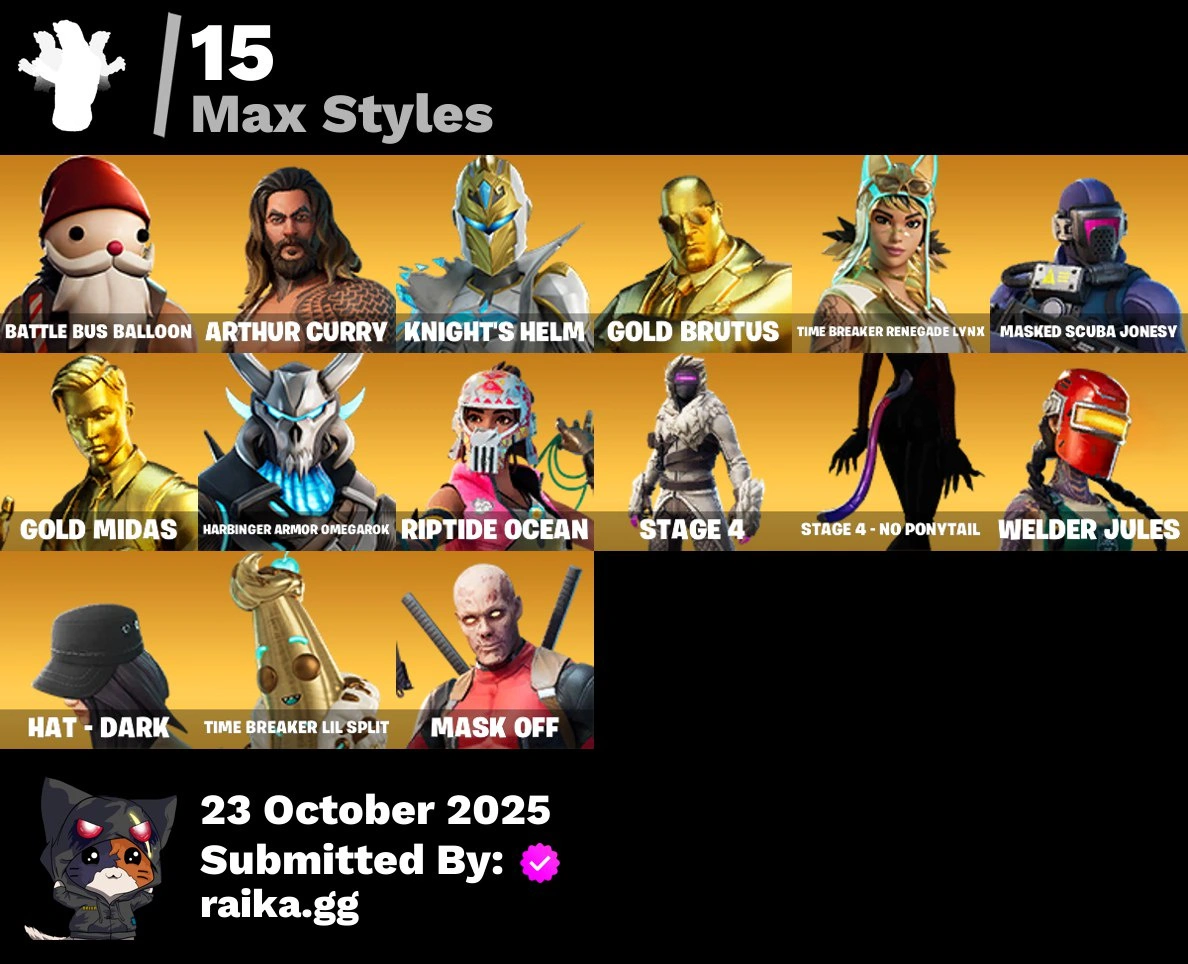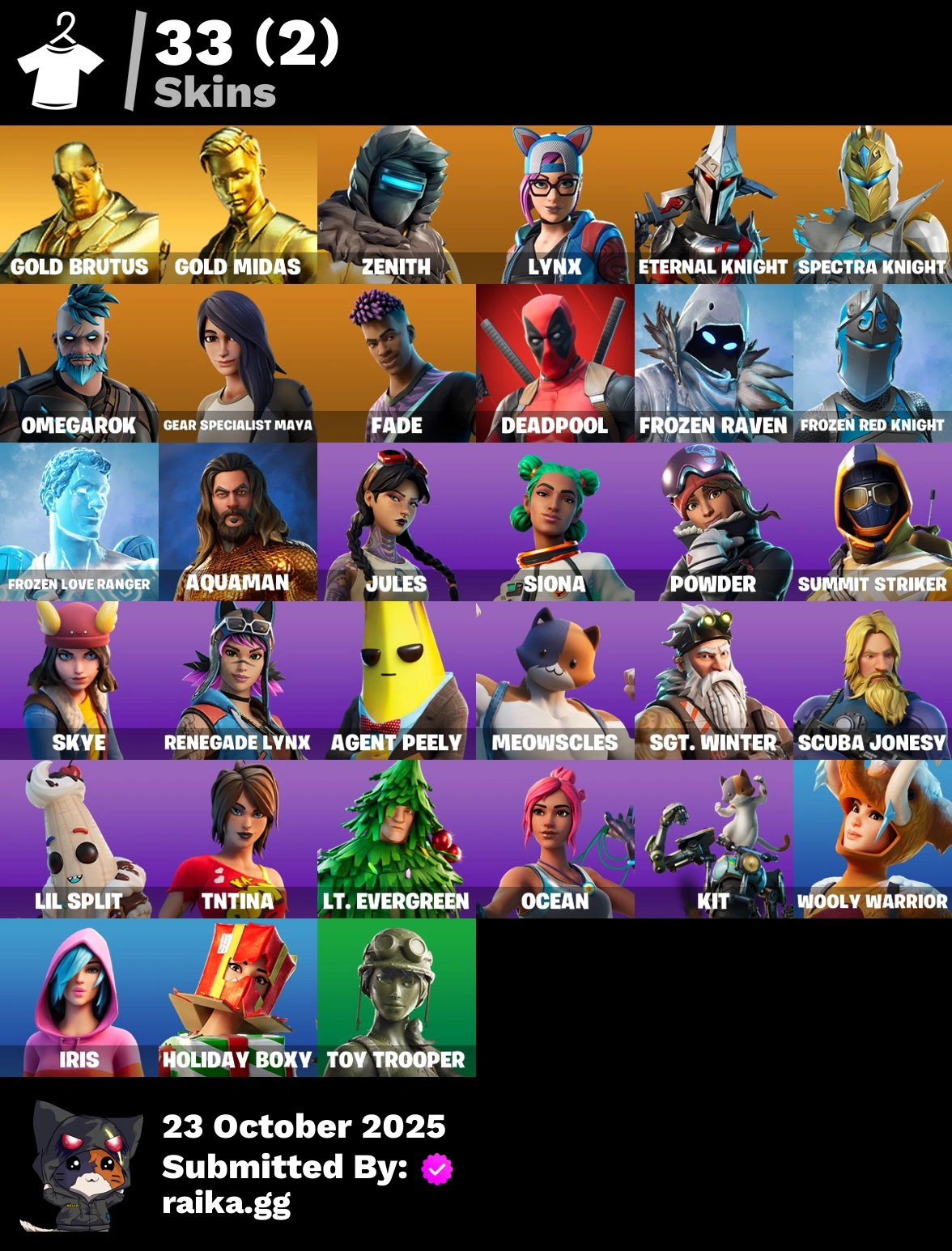 [PC/PSN/XBOX] 33 skins | Gold Brutus | Gold Midas | Zenith | Lynx | Eternal Knight | Spectra Knight | Omegarok | Gear Specialist Maya | Fade | Deadpool | 100 VB