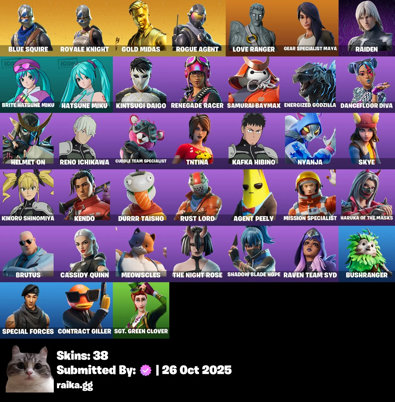[PC/PSN/XBOX] 38 skins | Blue Squire | Royale Knight | Gold Midas | Rogue Agent | Love Ranger | Gear Specialist Maya | Raiden | Brite Hatsune Miku | 1