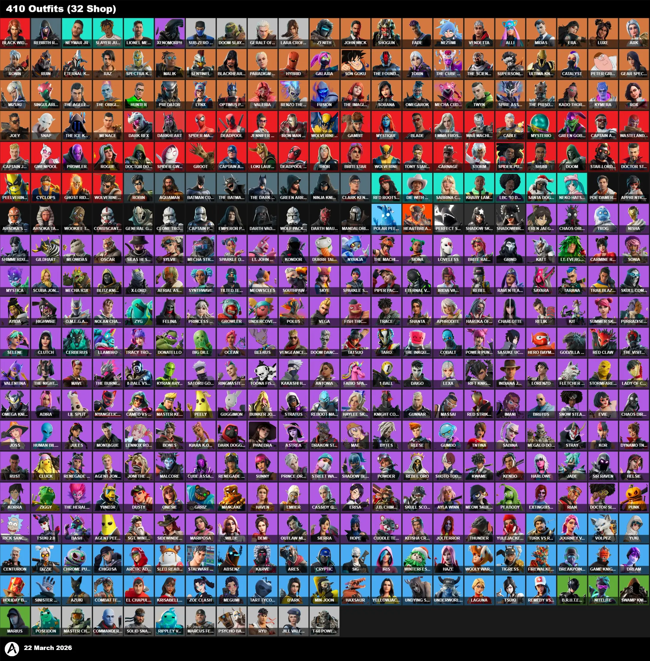 | PC/PSN/XBOX | 410 Skins | Lara Croft | Rebirth Raven | Sub-Zero | Black Widow | Doom Slayer | Geralt of Rivia | Juice WRLD | Neymar Jr | Xenomorph | Lionel Messi | Red Roots Billie | 999 Knives