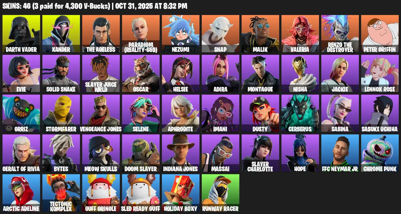 🍨 [PC/PSN/XBOX] 🌟 46 skins | Darth Vader , The Ageless , Paradigm (Reality-669) , Renzo the Destroyer , Solid Snake , Vengeance Jones , Doom Slayer , Indiana Jones , FFC Neymar Jr | 💙 350 VBUCKS | ✉️ Changeable Email Now