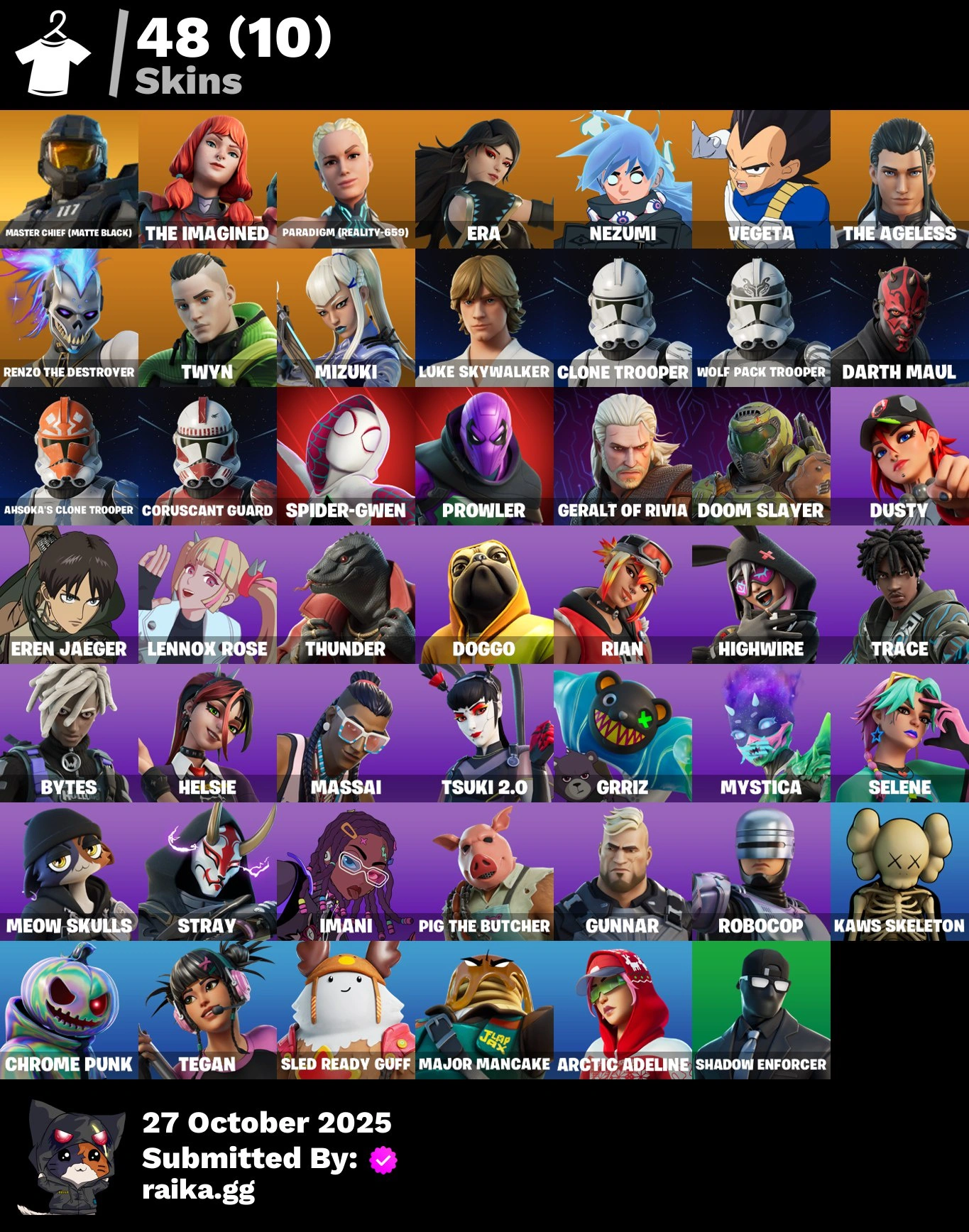[PC/PSN/XBOX] 48 skins | Master Chief (Matte Black) | The Imagined | Paradigm (Reality-659) | Era | Nezumi | Vegeta | The Ageless | Renzo the Destroyer | 1000 VB