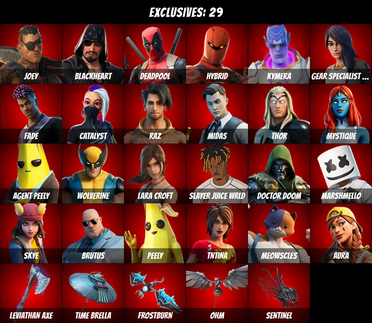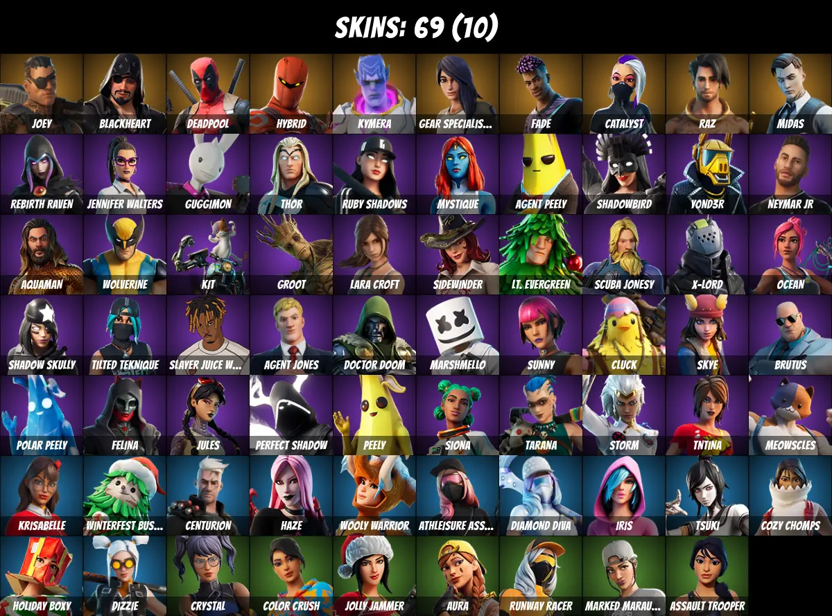 ⚡PC/PSN/XBOX⚡ 69 skins 💎 Leviathan Axe 💎 Deadpool 💎 Lara Croft 💎 Midas 💎 Jules 💎 Aura 💎 Peely 💎 Agent Peely 💎 Catalyst 💎 Meowscles 💎 Thor 💎 Crystal 💎 TNTina 💎 Brutus 💎 Wolverine 💎 Mystique 💎 Doctor Doom 💎 Joey 💎 Blackheart 💎 Hybrid 💎 400 V-Bucks 💎