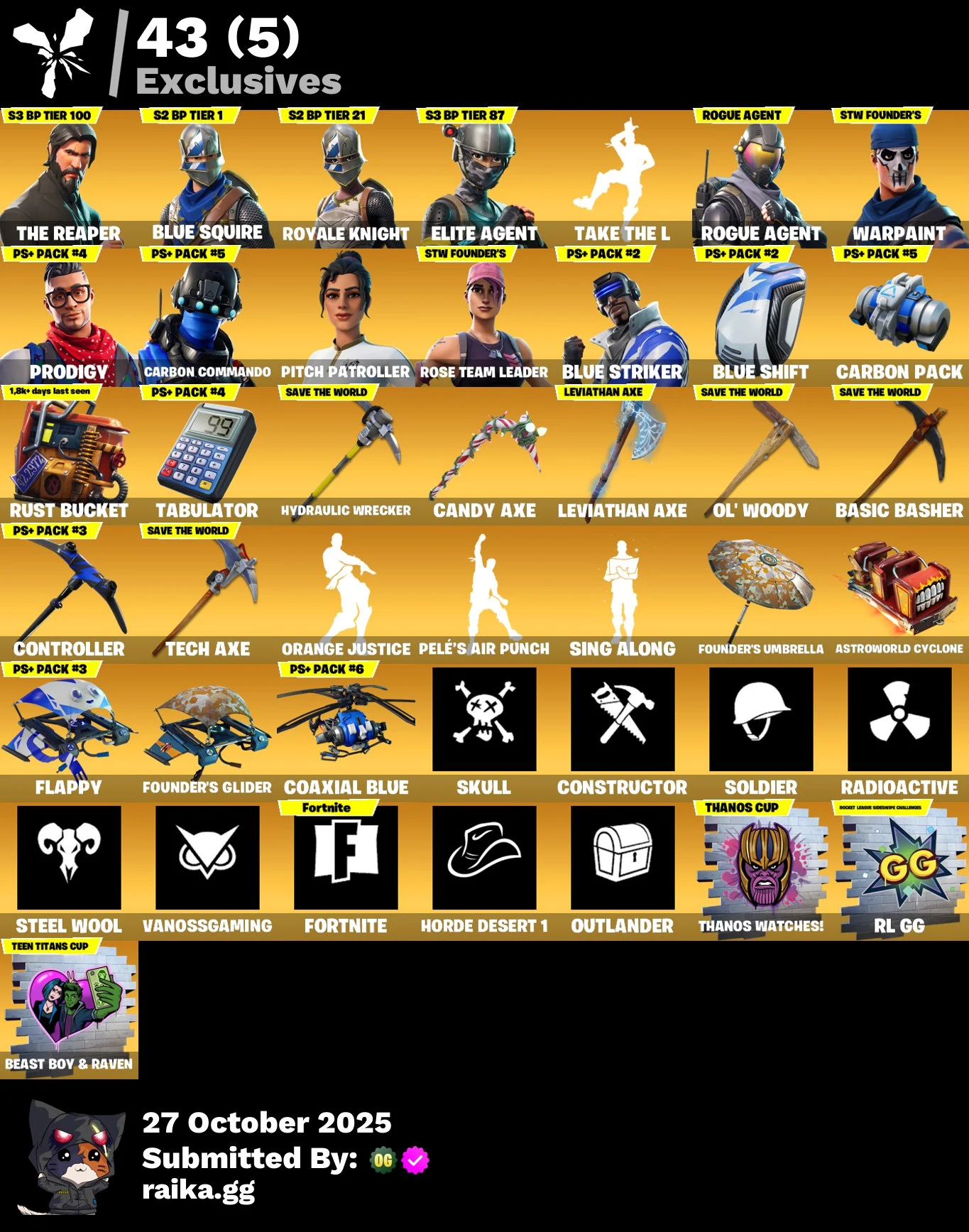 PC/PSN/Xbox/Nintendo 101 skins | OG STW | Leviathan Axe | The Reaper | Blue Squire | Royale Knight | Elite Agent | Rogue Agent | Prodigy | Carbon Commando | Pitch Patroller | 150 VB