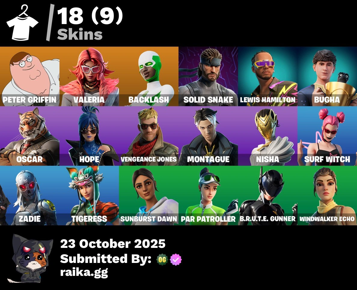 【PC/PSN/XBOX/SWITCH】 18 Skins | Backlash | Peter Griffin | Valeria | Solid Snake | Bugha | Lewis Hamilton | Oscar | Vengeance Jones | Montague | Hope | Nisha | 450 VB | FS7