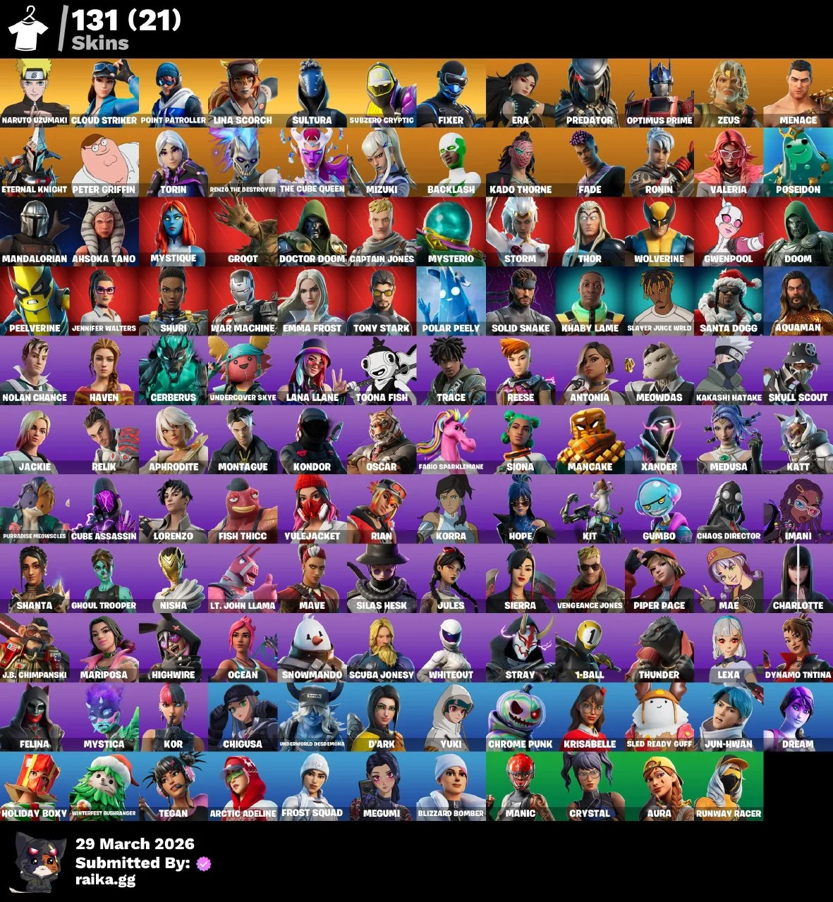 PC/PS/XBOX/SWITCH | 131 Skins | Naruto Uzumaki | Optimus Prime | Predator | Subzero Cryptic | Era | 100 VB