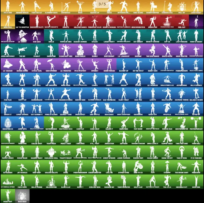 🕺 Emotes/Dances: The Rick Dance, Boogie Down, Rage, Disco Fever, Wakandan Salute, Crowning Achievement, Real Slim Shady, Pandemonium, Imperial March, Get Griddy, Lil’ Godzilla Attack, Mwahaha, Shadow Vox, Live From Haddonfield, Doom’s Domain ⭐
