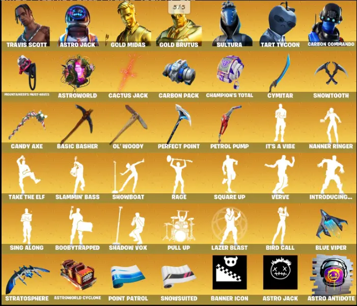 ⭐ Skins: Travis Scott, Astro Jack, Sultura, Carbon Commando, Blizzard Bomber, Sorana, Paradigm (Reality-659), The Foundation, Spectra Knight, Eternal Knight, The Scientist, Hybrid, The Ageless, Peter Griffin, Deadpool, Driftwalker, Midas, Ninja, Slim Shady, Juice WRLD, Spider-Man (No Way Home), Spider-Gwen, Gwenpool, Geralt of Rivia, Doom Slayer, Solid Snake, Michael Myers, Ahsoka Tano, War Machine, Captain America, Thor, Groot, Aquaman, Shuri, Catwoman Comic Book Outfit ⭐