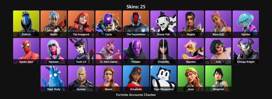 PC/XBOX 25 Skins⚡ | Sultura | Ronin | The Imagined | Cyclo | The Foundation | Toona Fish | Shanta | Kiara K.O. | Gumbo | Spider-Man | Harlowe | Tsuki 2.0