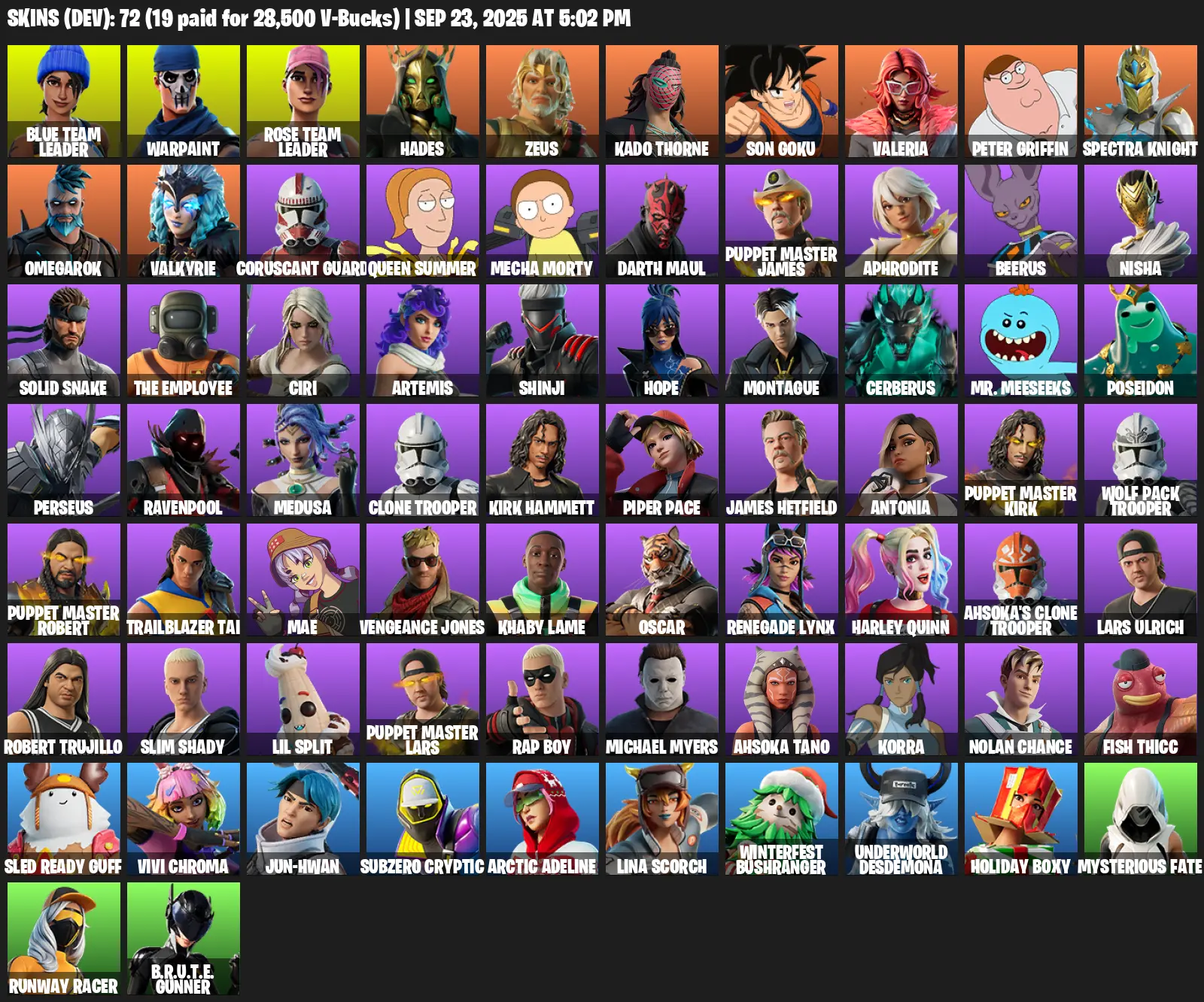 [PC/XBOX] | 72 skins | OG STW | Blue Team Leader | Warpaint | Rose Team Leader | Hades | Zeus | Kado Thorne | Son Goku | Valeria | #VRP7553 | #MBFN