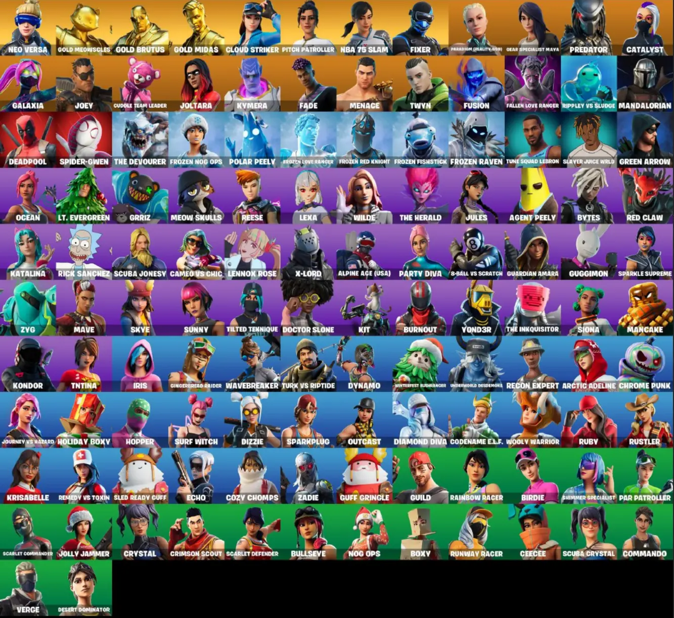 Cloud Striker, Neo Versa, Fixer, Gear Specialist Maya, Cuddle Team Leader, Deadpool, Midas, Predator, Twyn, Kymera, Mandalorian, Paradigm (Reality-659), Fallen Love Ranger, Frozen Raven, Frozen Red Knight, Joltara, Fusion, Menace, Galaxia, Spider-Gwen, Green Arrow, Rick Sanchez, Guardian Amara, Tune Squad LeBron, Doctor Slone, The Herald, The Devourer, Underworld Desdemona, Codename E.L.F., Rippley vs Sludge, Slayer Juice WRLD, Polar Peely, Nitehare, Meowscles, Dynamo, Recon Expert.
