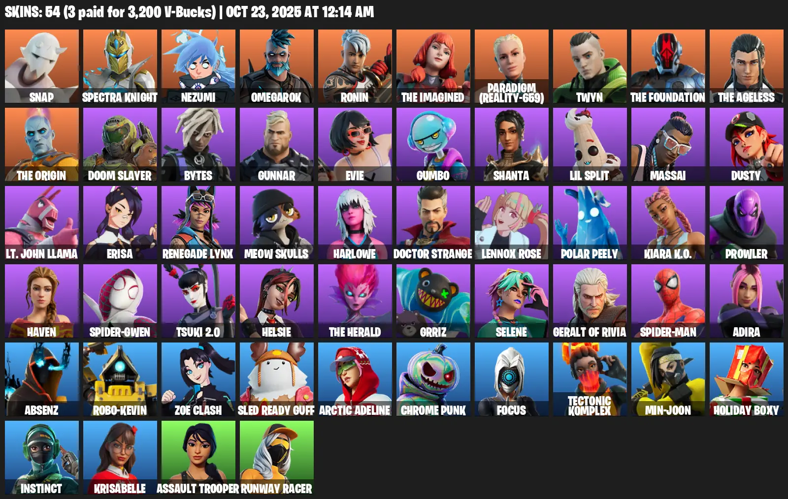 [PC/XBOX/PSN] 54 Skins | Snap | Spectra Knight | Nezumi | Omegarok | Ronin | The Imagined | Paradigm (Reality-659) | Twyn | The Foundation | The Ageless | The Origin | Doom Slayer | Bytes | Gunnar | Evie | Gumbo | Shanta | Lil Split | Massai | Dusty