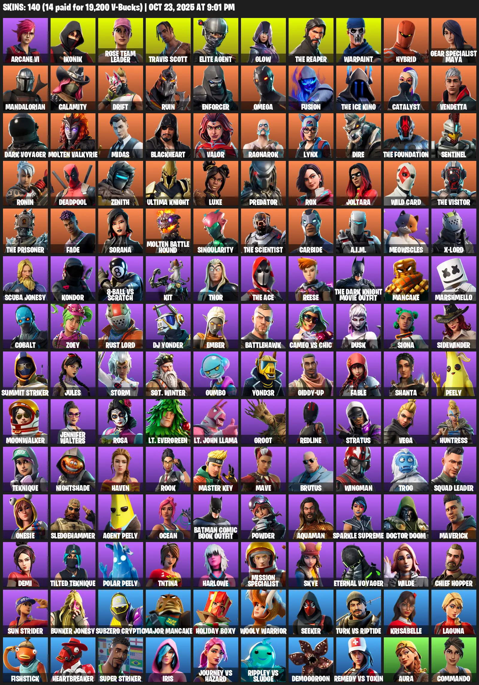 [PSN/XBOX/PC] 140 Skins | Arcane Vi | IKONIK | Rose Team Leader | Travis Scott | Elite Agent | Glow | The Reaper | Warpaint | Hybrid | Gear Specialist Maya | Mandalorian | Calamity | Drift | Ruin | Enforcer | Omega | Fusion | The Ice King | Catalyst