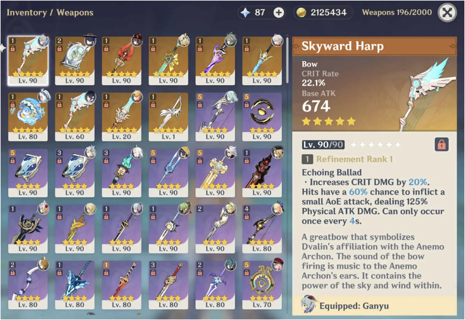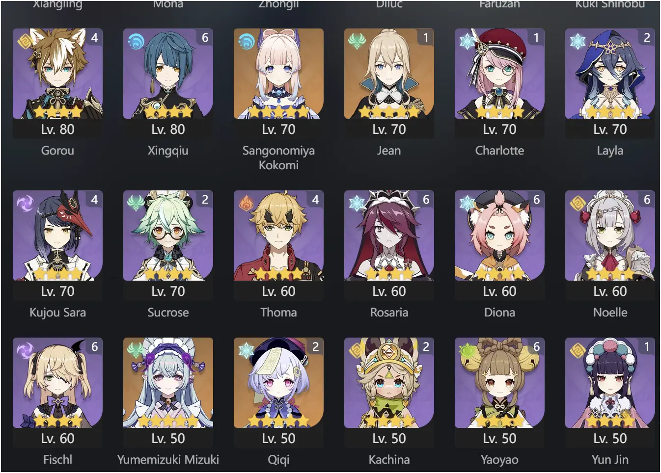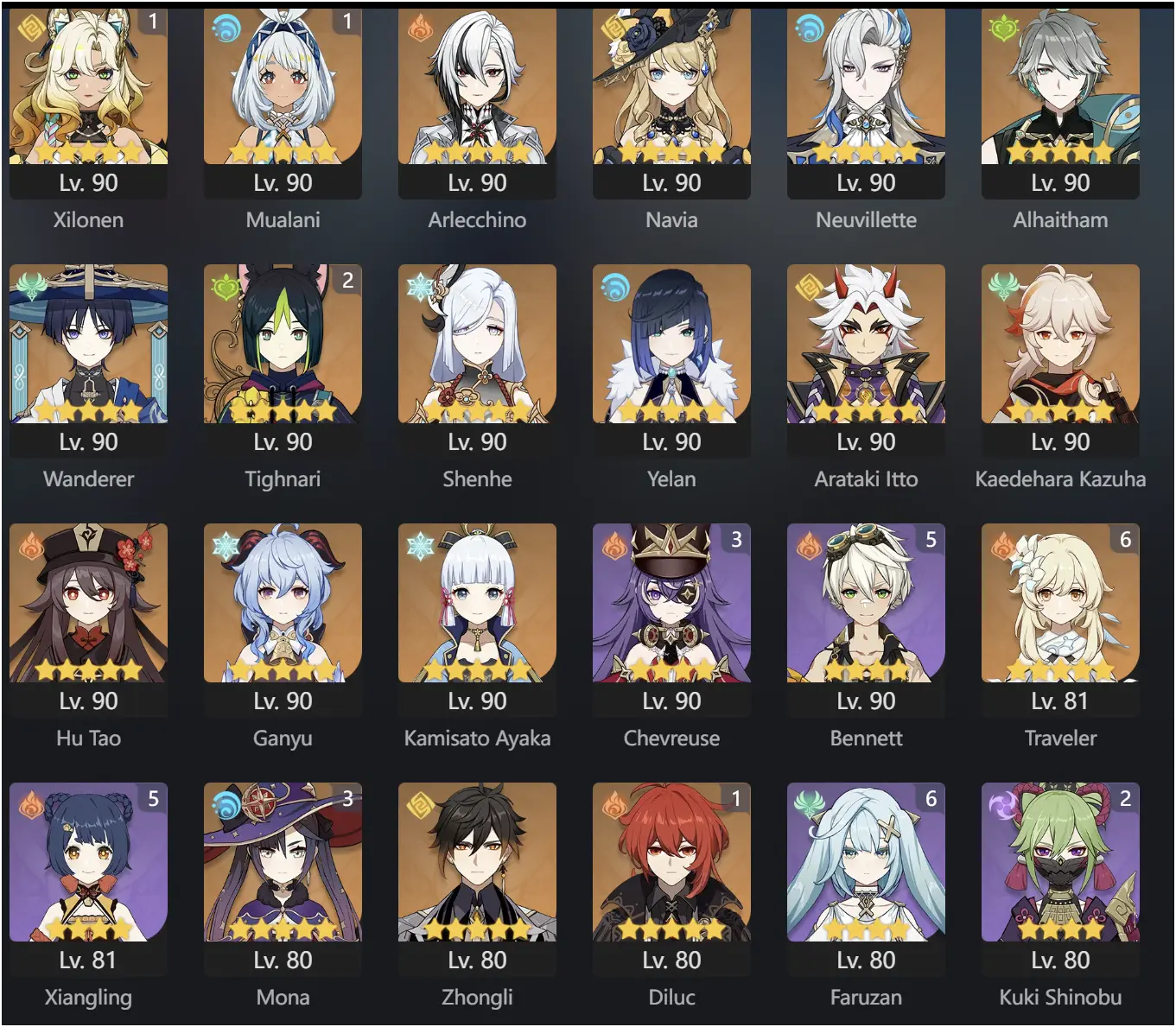 Xilonen c1 , mualani c1 , Arlecchino Navia Neuvilltee alhaitham wanderer Shenhe Yelan Itto Kazuha Hu tao Ganyu Ayaka Zhongli Kokomi ar60