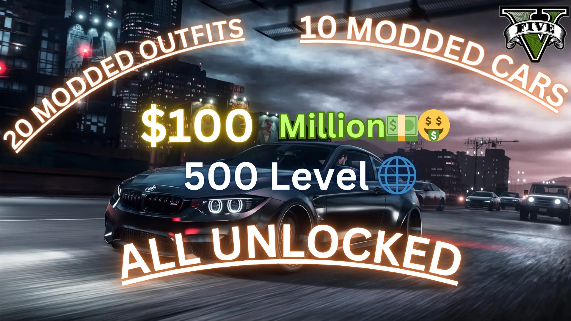 [🎮 GTA V ⸱ PC ] ⸱ 💸 $100 Million , 👚 20 Modded Outfits, 🚗 10 Modded Cars, 🏆 Level 500 🌍, 📈 Max Stats 🔝, 🔓 Unlocked Everything, Billion KD ⚡