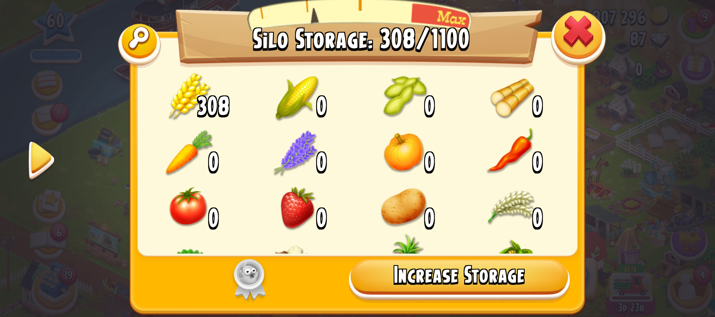 60 level | Barn Tools farm | Barn Storage 4000 | Silo Storage 1000 | 2.5M Coin | 50 gems | barn items