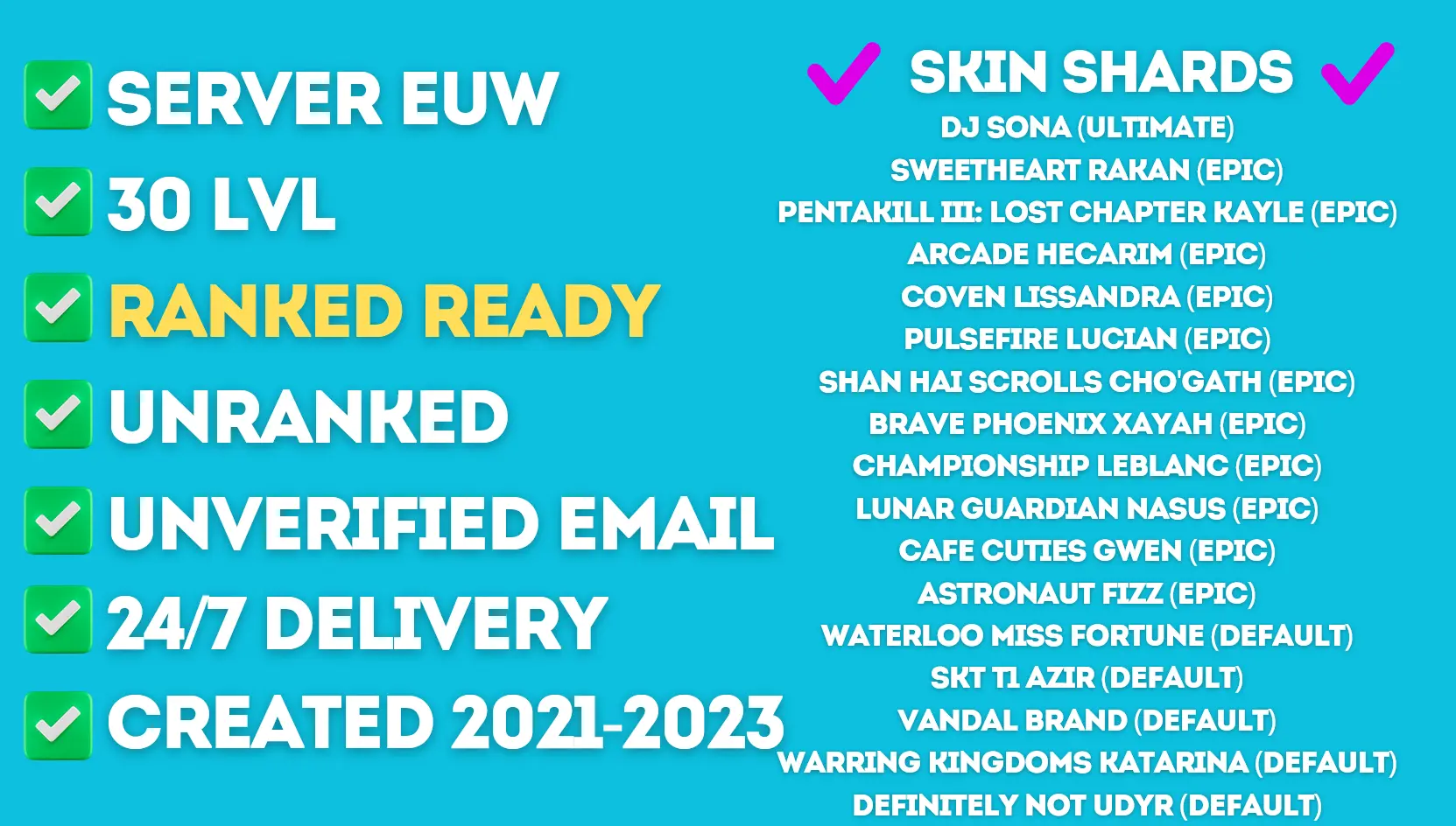 EUW 30 LvL ✅ Ranked Ready ✅ BE: 57595 ✅ Unverified ✅ Unranked ✅ Shards: DJ Sona, Sweetheart Rakan, Pentakill III: Lost Chapter Kayle, Arcade Hecarim, Coven Lissandra, Pulsefire Lucian, Shan Hai Scrolls Cho'Gath, Brave Phoenix Xayah, Championship LeBlanc