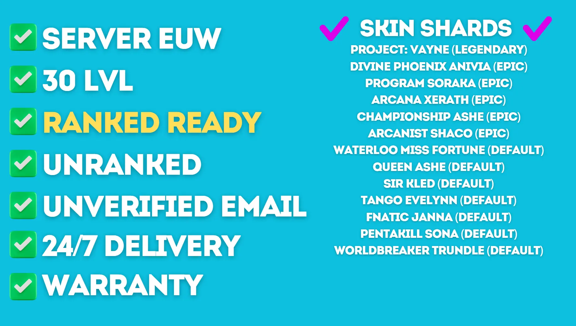 EUW 30 LvL ✅ Ranked Ready ✅ BE: 59910 ✅ Unverified ✅ Unranked ✅ Shards: PROJECT: Vayne, Divine Phoenix Anivia, PROGRAM SORAKA, Arcana Xerath, Championship Ashe, Arcanist Shaco, Waterloo Miss Fortune, Queen Ashe, Sir Kled, Tango Evelynn, Fnatic Janna