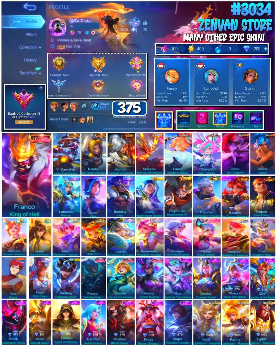 #3034 🔥 375 Skins 🔥 Legend Franco 🔥 Collector Yin Sun Shin, Natalia 🔥 Soul Vessels Aamon 🔥 Internal Moskov 🔥 Aspirant Fanny, Change 🔥 KoF Chou, Karina 🔥 Many Limited 🔥 Many Zodiak 🔥 Many Epic 🔥 Safe Account ✅