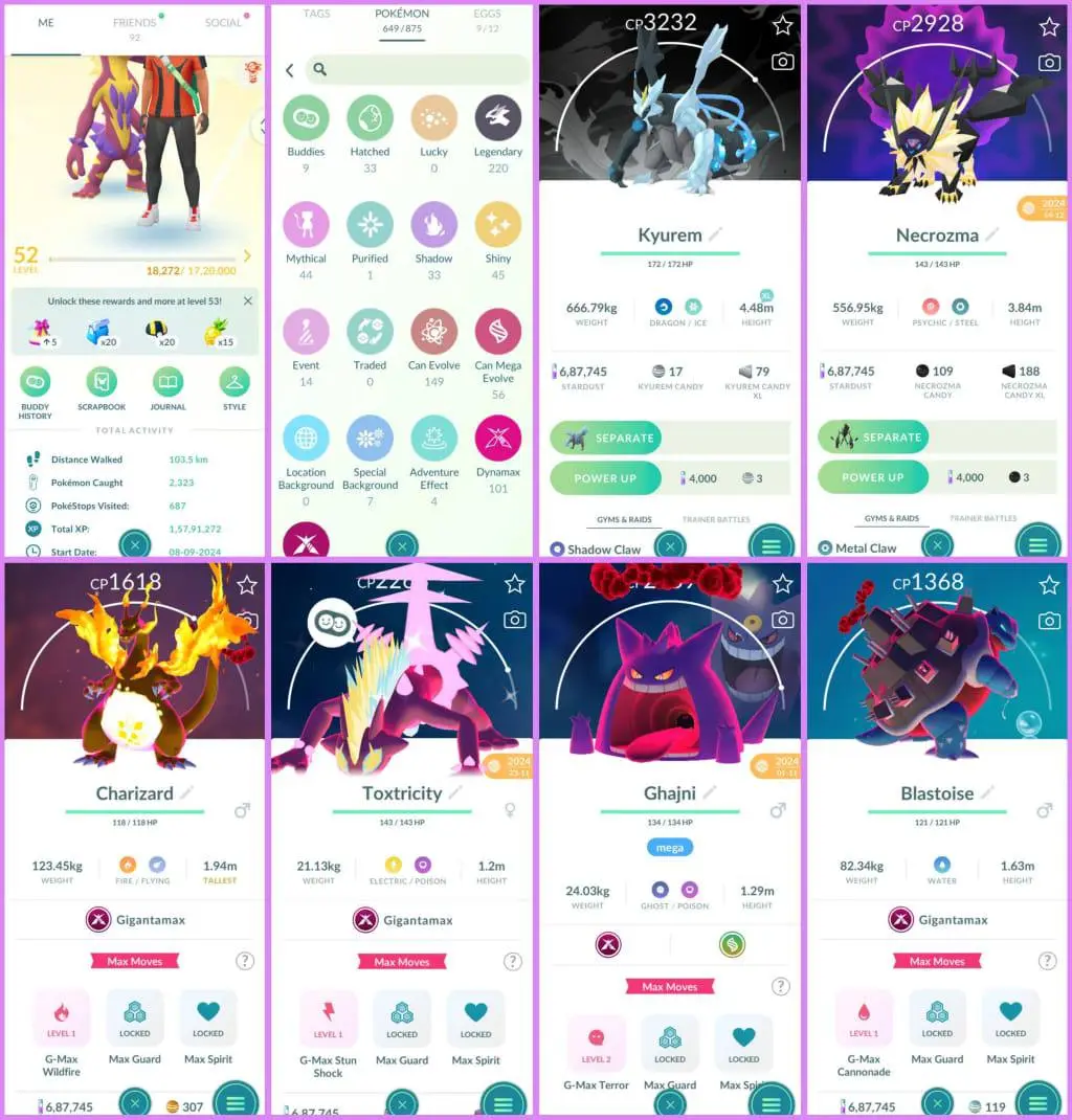 LEVEL 52(INSTINCT)💎649/875 Pokemon💎220 Legendary💎101 Dynamax💎Fusion Kyurem💎Fusion Necrozma💎G-Max Charizard💎G-Max Toxtricity💎Name Change Available💎Instant Delivery🚚