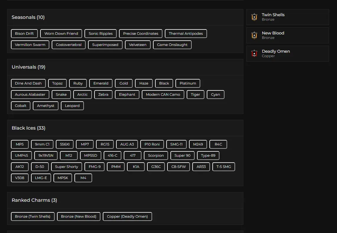 • Black Ices - (MP5K, AR33, C8-SFW, G36C, PMM, FMG-9, AK12, Super 90, 417, 416-C, 9x19VSN, UMP45, R4C, SMG-11, MP7, 556XI, 9mm C1, MP5, M4, LMG-E, V308, T-5 SMG, K1A, Super Shorty, D-50, Type-89, Scorpion, MP5SD, M12, M249, P10 Roni, AUG A3, RG15)