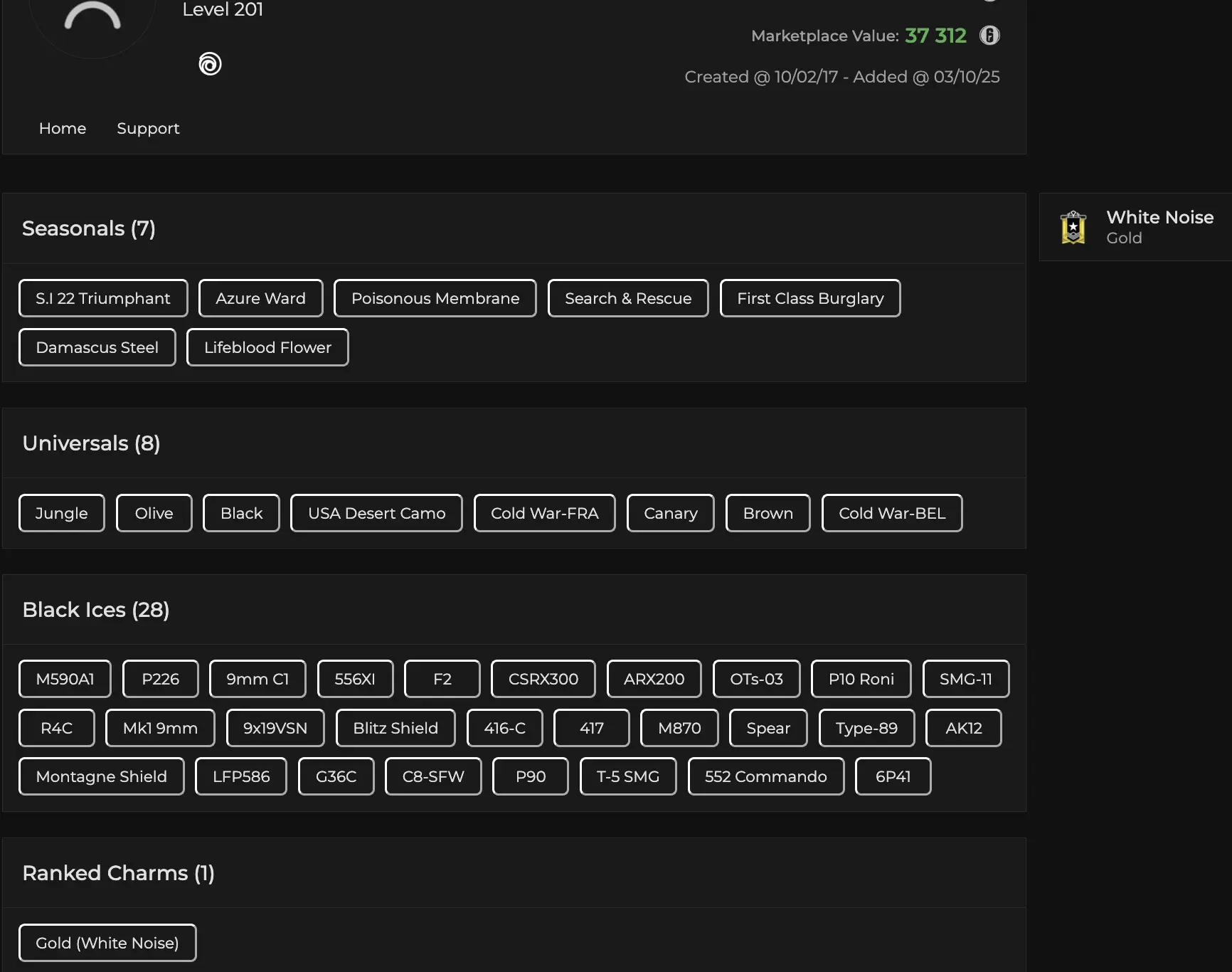 🏓 [PC/PSN/XBOX] Ranked Ready | Level 201 | 28x Black ice | Azure Ward | 7x Seasonal | 8x Universal | 25x Legendary Skins | 4x Pro League | Elite | Special | 66 Operators | 120,118 Renown 💰