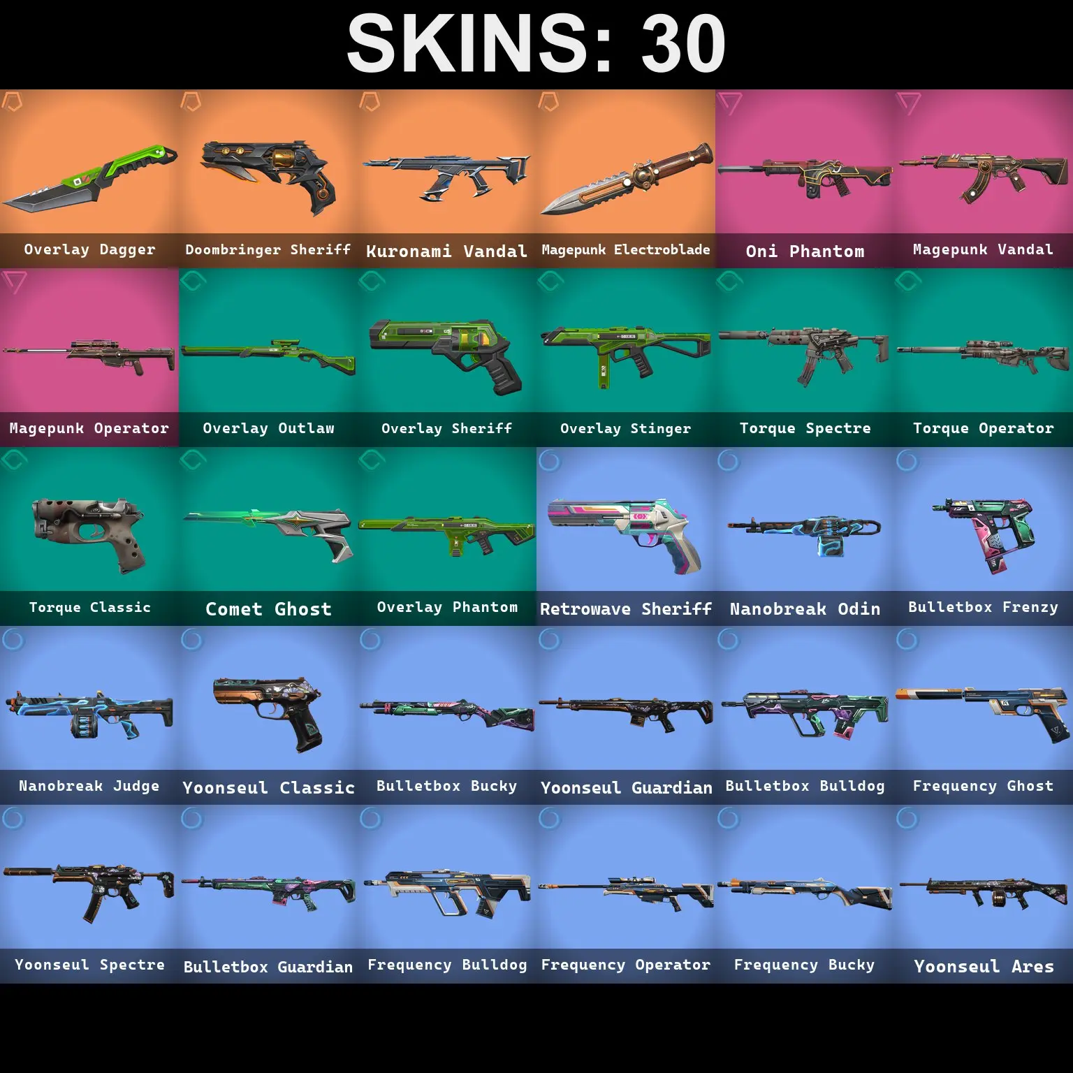 30 SKINS | 2 KNIFE | KURONAMI VANDAL | MAGEPUNK VANDAL | MAGEPUNK OPERATOR | MAGEPUNK ELECTROBLADE | ONI PHANTOM | DOOMBRINGER SHERIFF | COMET GHOST | OVERLAY DAGGER | OVERLAY OUTLAW | OVERLAY SHERIFF | OVERLAY STINGER | TORQUE SP