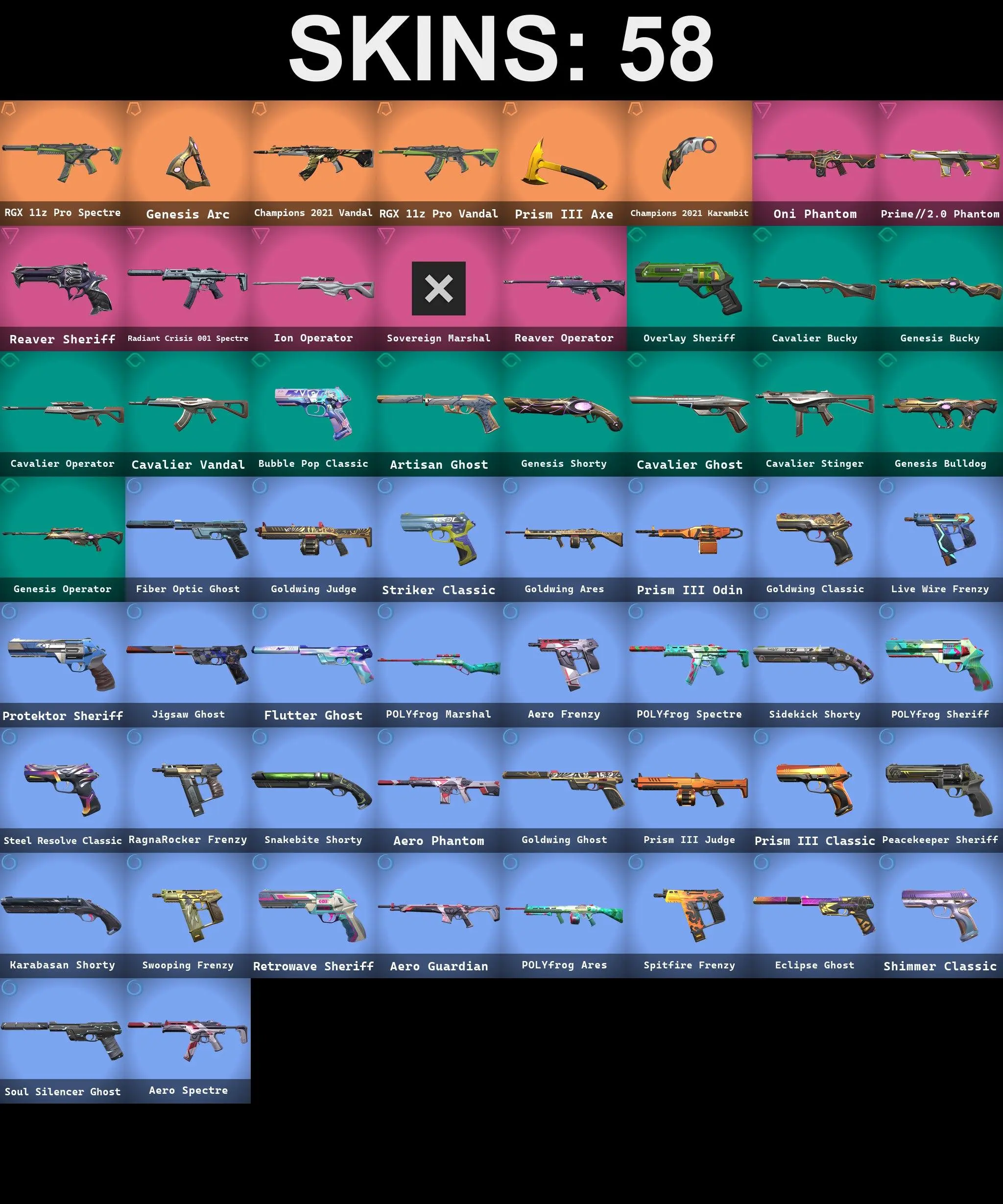 58 SKINS | 3 KNIFE | CHAMPIONS 2021 KARAMBIT | CHAMPIONS 2021 VANDAL | RGX 11Z PRO VANDAL | RGX 11Z PRO SPECTRE | REAVER OPERATOR | REAVER SHERIFF | RADIANT CRISIS 001 SPECTRE | SOVEREIGN MARSHAL | PRIME//2.0 PHANTOM | ION OPERATO